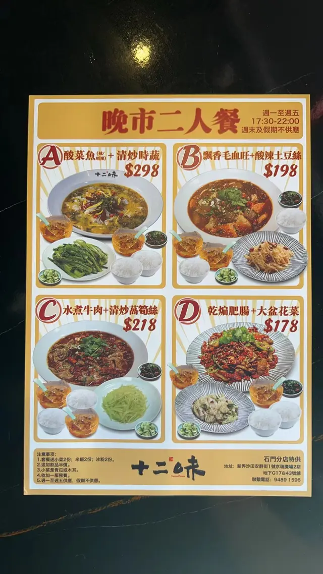 十二味 (京瑞廣場2期) (沙田) 網上訂座享低至8折優惠兼賺Rice Dollars 網址: https://s.openrice.com/QrbS0pD4B00 地址: 香港沙田石門安群街1號京瑞廣場2期地下G17及G43號舖 電話: +852 94891596