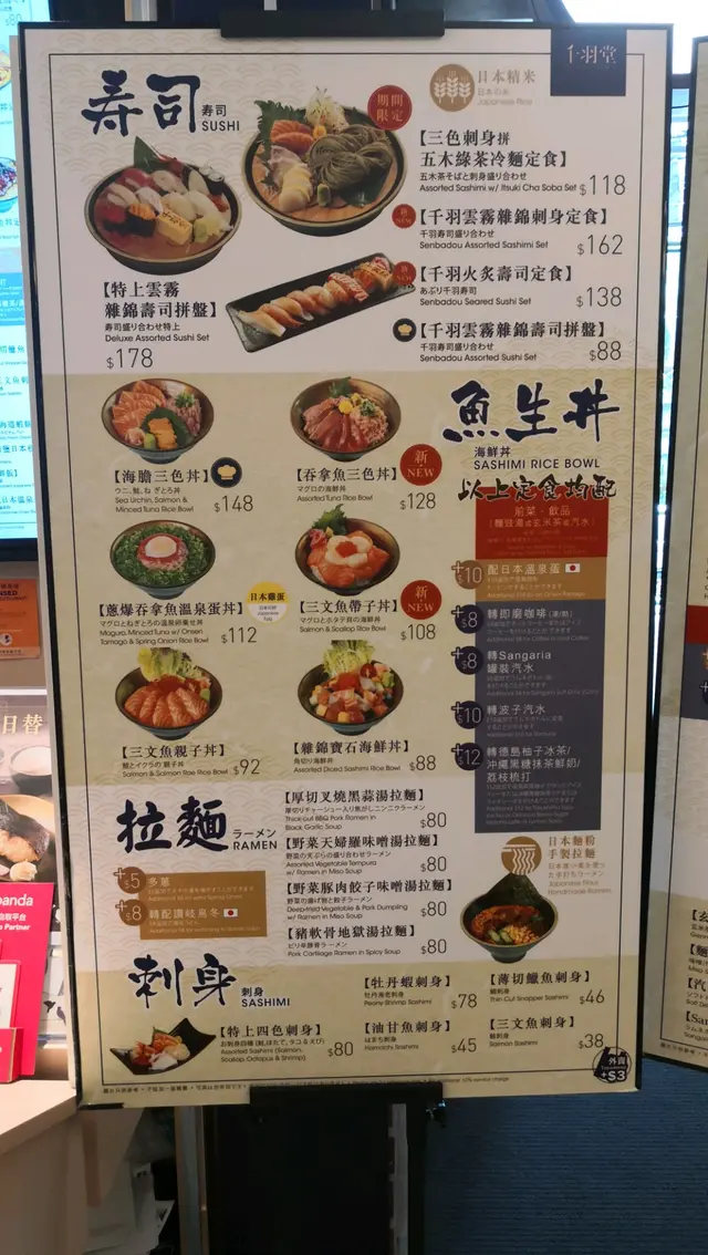 所以今次就揀左係office附近嘅美國銀行大廈入面"千羽堂"openrice search過"千羽堂"係無其他分店咁就更加要試下小店啊有自助機 亦有人手付款 採取先付款後取餐形式我就揀左三色刺身拼五木綠茶冷麵定食$142加一刺身有三種:帶子 三文魚 同鯛魚刺身好新鮮 但份量可以多d 再加綠茶冷麵同沙律 沙律唔太多汁冷麵就夠份量 果然係有淡淡綠茶味