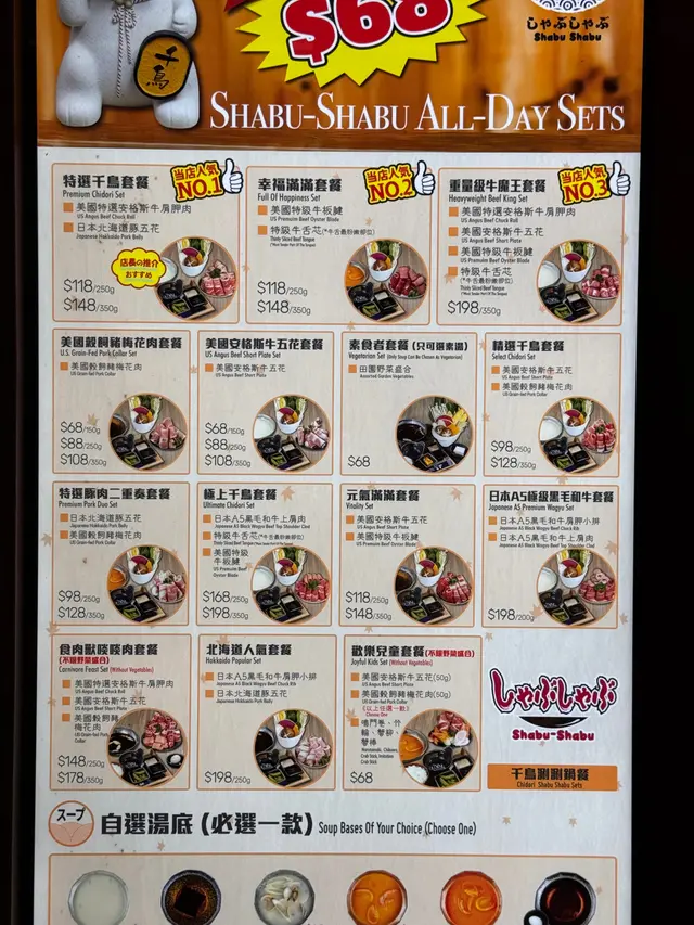 油麻地旺角一帶為美食天堂眾所皆知,平時行街只有見到一人燒肉餐廳,例如燒肉LIKE 、牛繁等等,近排睇Thread見到一間大熱的日式火鍋店,叫做千鳥しゃぶしゃぶ,呢間火鍋店係一人一鍋模式,即是一人獨食又得,多人共享都可以,仲發現原來地點同小妹居住點近在咫尺😍琴晚就同老公去咗食啦!昨晚大概七點搭三去到千鳥,已經要攞飛排隊等位啦,好彩早咗少少🤏🏻到咋,越晏越多人等位呀,因為呢間餐廳係沒有限時㗎,非常難得🤩好彩人流都算好快,等咗大概三、四個字就入得嚕😎店內環境非常舒適優美,兩人座位有撐枱腳座位及排排坐座位(意思是膊頭掂膊頭果種),小妹兩公婆被安排坐排排坐座位🤭小妹與老公「肥C大隻」排排坐都唔覺得迫,張枱都算幾大架,腳長都不怕,冷氣夠強一啲都唔熱❣️抵讚呀🥰🥰餐點方面係以套餐形式提供,每一份套餐都包括前菜、飯、湯底、肉類、野菜盛合!價錢由最划算$68到最貴價$198,套餐份量仲分為150g、250g、350g,一個人食絕對夠飽。肉類擺盤非常精美,睇落份量好多㗎,仲可以用靚靚價錢食日本A5和牛;野菜盛合有菇有菜有南瓜🎃仲有少有的心內美蘿蔔添😍;唔想食白飯可以加錢轉食烏冬、拉麵或玉子雜炊飯;湯底合共有六款揀,免費的只有豬骨湯及日本昆布鰹魚湯,其餘的要加錢改配。小妹兩公婆每人叫一個餐,一個配白飯,另一個配玉子雜炊飯:🍲極上千鳥套餐($168/250g)肉食:日本A5黑毛和牛上肩肉、特級牛舌芯[牛舌最粉嫩部位]、美國特級牛板腱🥬🍄🟫野菜盛合湯底:日本昆布鰹魚湯主食:玉子雜炊飯(+$12)前菜:芥末枝豆&醋薑🍲幸福滿滿套餐($148/350g)肉食:美國特級牛板腱、美國特選安格斯牛肩胛肉🥬🍄🟫野菜盛合湯底:自家製鮮番茄濃湯(+$15)主食:白飯250g前菜:芥末枝豆&醋薑兩份套餐共四款肉食,除咗牛肩胛肉牛味比較騷之外,其他都非常好食丫,小妹的番茄濃湯超級濃厚,第一個感覺係似龍蝦濃湯,如果配烏冬一定超級完美❣️前菜酸酸辣辣超解膩😚玉子雜炊飯被直男老公讚好有儀式感🤭🤭。因為火鍋食到差唔多先再同店員講可以上炊飯,店員會親自上陣,將雜炊飯材料:白飯一碗、日本蛋、黑椒碎、紫菜絲、蔥花、芫茜、櫻花蝦及拌飯素,逐一在眼前調製給你食😳如同直男老公所說「真係好有儀式感!」…查看更多