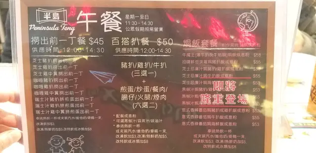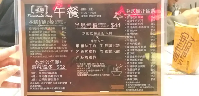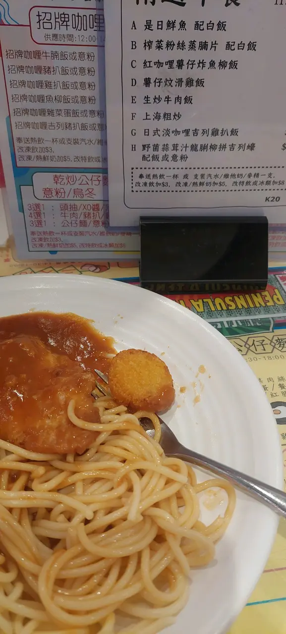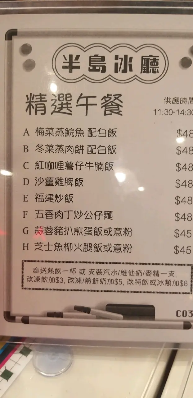 竹園街市裝修以來都大係獲好評,而街市內有這一家茶餐廳 - 半島冰廳。呢期大部份新開的茶餐廳都係以懷舊為主題,呢間半島冰廳也不例外。之前到過半島食過早餐同晚餐,今次過黎試午餐。我地揀左(C)紅咖哩薯仔牛腩飯,同(G)蒜蓉豬扒煎蛋意粉,最特別係可以配支裝凍維他奶同凍麥精,係無熱的。先黎(G)蒜蓉豬扒煎蛋意粉配支裝可樂,蒜蓉豬扒好薄好柴皮,只係一個普通的豬扒都整成咁😨,意粉就冧嘅,係個汁同雞蛋比較正常,成碟野都好求期。再黎(C)紅咖哩薯仔牛腩飯配熱檸檬茶,呢個餐比個豬扒好,紅咖哩有d新意,牛腩正常。整體而言,比起早餐同晚餐,午餐真係好差好失望👎,同樣差的出面個間茶餐廳,半島可以儲街市分,係一個優勢。查看更多