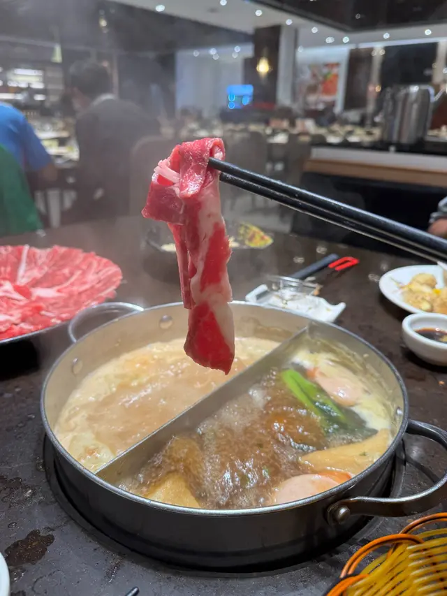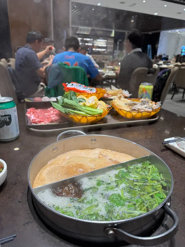 多款火鍋配料火鍋配料豐富且質素高。牛肉嫩滑油花均勻,入口帶牛脂香是招牌。四寶丸:蝦丸、墨魚丸、鯪魚丸、豬肉丸,鮮味十足且彈牙爽口。鱔片新鮮無泥味,適合清湯涮煮。炸魚皮與響鈴,炸至鬆化,放入湯中吸汁後味道特別出色。蔬菜拼盤,菜葉新鮮。沙嗲湯底,濃郁香味與牛肉非常配合,其他餃類、丸丸、出前一丁正常發揮。還有汽水啤酒任飲,爽呀!…查看更多
