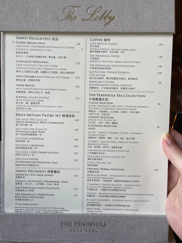 This time we are in the Peninsula lobby restaurant for the summer grill menu which showcase their signature steaks.The meal included tea or coffee that they offered on the drinks menu. We order organic herbal infusions from the tea selection.We ordered sets for two people, one of each from the menu. Firstly there is the grilled black angus grain fed striploin, and second of all we have the grilled U.S. double gold ribeye steak. We ordered medium rare but it turned out medium well for both our steaks. The ribeye had a more pleasant taste comparing to the striploin. The steaks came with bernaise sauce, black pepper sauce and beef jus.The set also came with Tom yum or typhoon shelter style tater tots which we also had one of each. These were super tasty, it was deep fried but wasn’t too oily. The typhoon shelter style was the winner of the two, it was spicy but just right.The meal ended with fruit platter with lemon sorbet.…查看更多