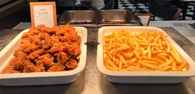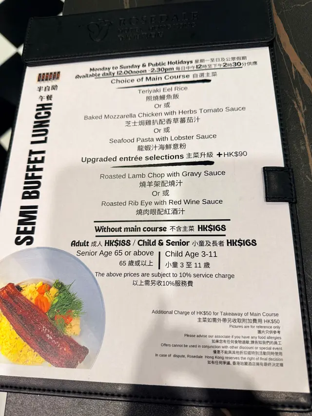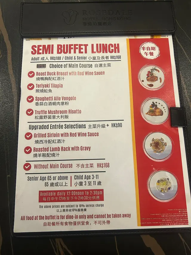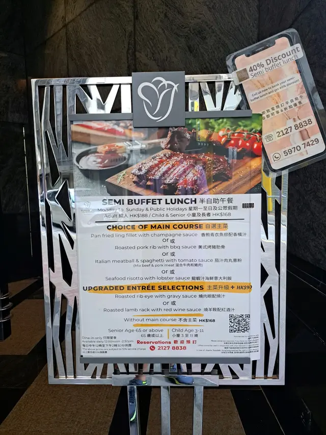 講咗主食先。松露野菌意大利飯份量正常,味道淡咗啲,亦都比較稀,但係夠熱嘅。照燒𩶘魚讚一下就係魚夠大塊,底下有啲薯蓉同兩粒番茄仔。但個照燒汁真係破壞曬啲食慾。甜甜地,味道奇奇怪怪,唔似平時嘅照燒汁,比較杰身。啲薯條有燈照住,暖暖地,但硬身。試咗牛奶粟米,幾Juicy,好食。青口中規中矩,凍咗少少。關東煮裡面有幾款唔同形狀嘅魚糕,但食落都係一樣口感&味道,無白蘿蔔&年糕食,凍咗少少。呢間餐廳唯一我encore咗兩次嘅野食—麵包。夠暖同軟熟。佢有提供獨立包裝嘅Anchor牛油。湯有中湯同西湯。中湯係紅蘿蔔粟米湯,無試。西湯係番茄湯。呢個番茄湯飲落係茄膏直接溝水咁,幾酸,夠熱。仲有啲冷盤小食,計埋沙律菜大概8款左右。我試咗少少,無特別好食。亦無芝士提供。飲品有咖啡、牛奶、熱茶、檸檬片、橙汁提供。咖啡牛奶正常,有部機保暖,所以都係熱嘅。橙汁唔係鮮橙汁,唔推薦。甜品方面,有生果盤、芝麻糊、四款西式甜點加朱古力噴泉。生果盤係西瓜蜜瓜撈埋罐頭生果,正常。芝麻糊係開粉嘅,亦都唔香。西式甜點死甜,唔好食。雪糕完完全全就係雀巢三色雪糕嘅味道。總結,我都好耐無食過一餐係咁劣食,大部分野食質素好差,得少部份擺得入口。雖然話半價每位$113,但真係去普通cafe正常食一餐仲好。要講佢好嘅地方就係啲職員服務幾好,態度有禮同helpful。…Read More
