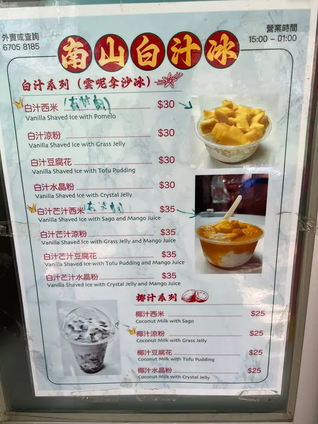 南山白汁冰 (石硤尾) 網址: https://s.openrice.com/QrbS0zvG6W0 地址: 香港石硤尾大坑東道111號南山邨南山商場平台CCC9號舖 電話: +852 67058185