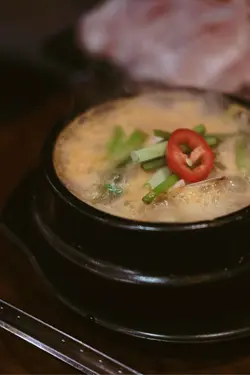 。辣牛肉湯,湯裡配料十足,有豆腐、蔬菜,牛肉,雞蛋等。湯底濃郁鮮辣,牛肉燉到極腍滑,一咬即化又保留肉香。成晚湯辣度溫和唔嗆喉,帶絲絲甜味同發酵豆香,用來拌飯食絕對一流