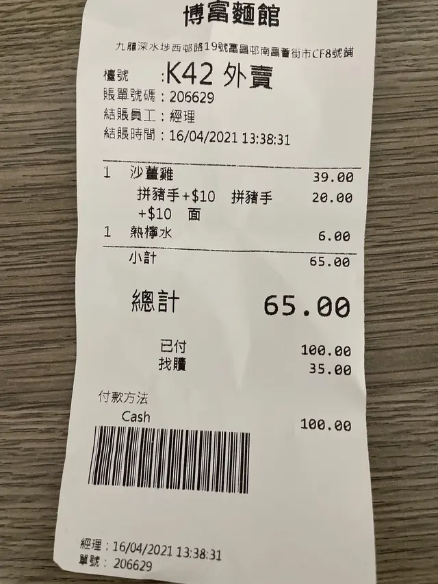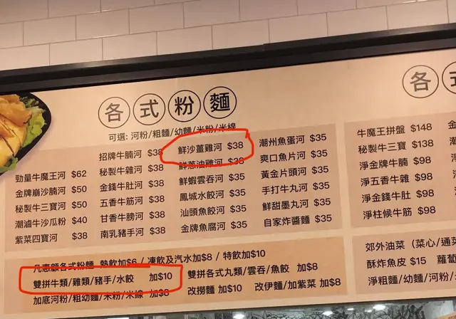 店員同我媽講,豬手要加20蚊,我媽吾知價錢,就是但,睇番張單,就寫係個麵另外加收左錢。餐牌到寫明38蚊沙薑雞河,加豬手係加10蚊,檸水6蚊,外賣加1蚊,正常價格係55。間店見到師奶會呃錢,呢個行為太過差勁,令到我第一次寫食評就係比呢間店,以後吾會再幫襯!查看更多
