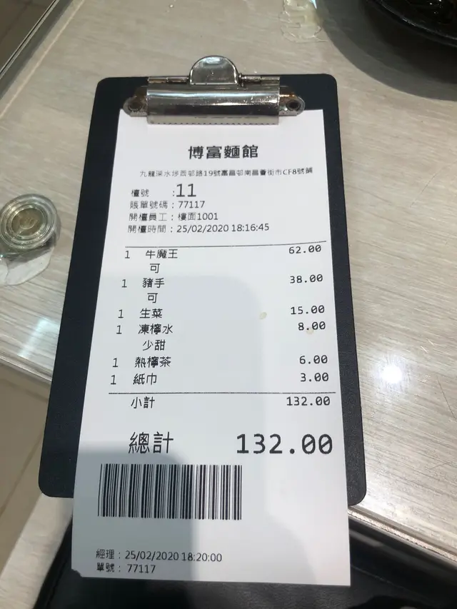 南昌薈係新落起嘅商場,多咗一個街市同埋好多商店,所以特登嚟試吓街市裏面嘅餐廳。主要見到兩間麵館比較多人食,又要想試吓鮮蝦雲吞,所以就揀咗呢間博富麵館。叫咗一碗鮮蝦雲吞幼麵,同一杯凍華田。等左大約5分鐘就上菜。鮮蝦雲吞有五粒,每粒都正常大細,裏面有鮮蝦同一啲肉碎,調味不錯,皮薄。麵方面就正正常常,冇煮得過熟。整體嚟講湯底比較普通,比起普通肉湯仲要淡,所以食落冇乜味道。另外有杯凍華田,已經叫咗少冰但係非常淡。埋單41蚊,呢個價錢可以有更好嘅選擇。查看更多