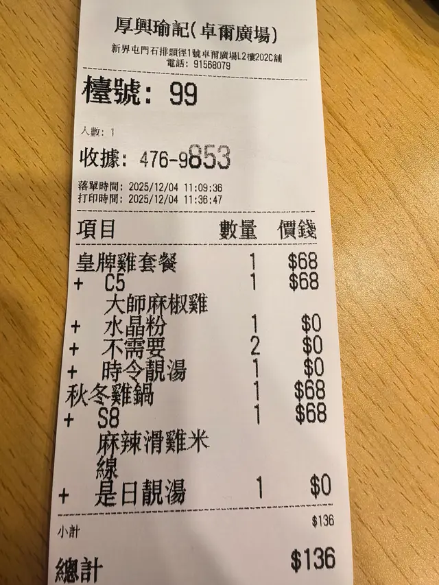 厚興瑜記手撕雞 (卓爾廣場) (屯門) 網址: https://s.openrice.com/QrbS0TLWB00 地址: 香港屯門石排頭徑1號卓爾廣場2樓202C號舖 電話: +852 91568079