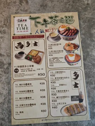 ,投其所好,就改到嚟食番餐叉燒飯。餐廳環境好大、好深長,入到去大把位揀,茶記格局,所以,主要都喺以卡位為主。雖然我哋得4個,但客唔多,都揀咗坐中間啲6人長枱,方便擺吓嘢。食物嘅選擇包羅萬有,唔會淨喺得燒味食,不過,既然以叉燒起名,自不然喺食佢啲叉燒飯,就算喺叉燒飯,都有好多配搭