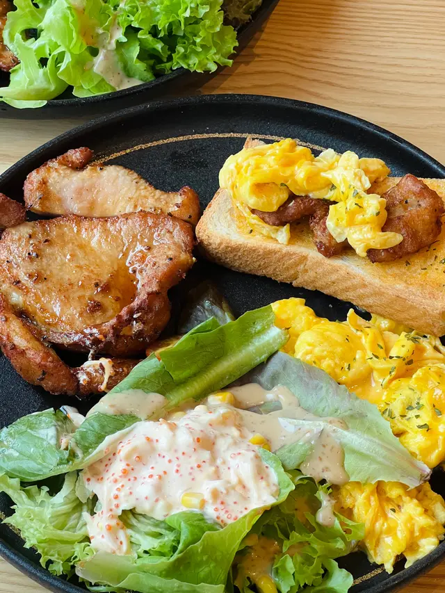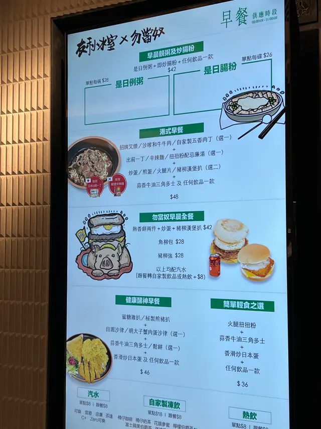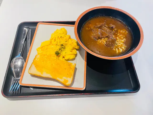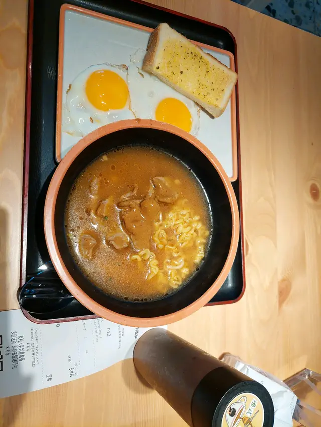 沙嗲和牛日本出前一丁、煎雙蛋、牛油蒜蓉多士、港式奶茶