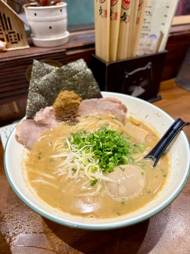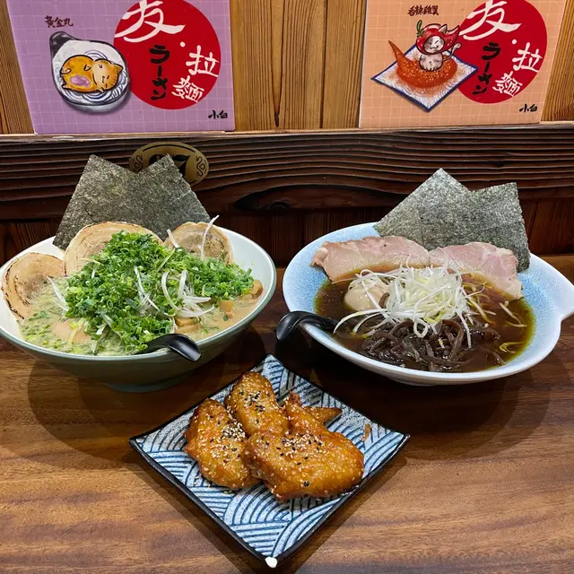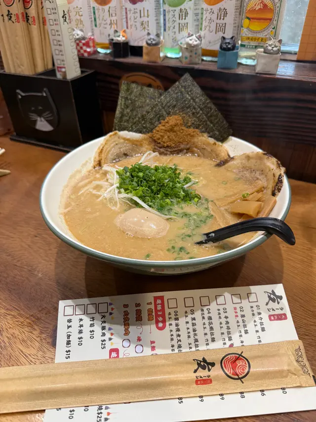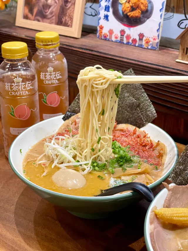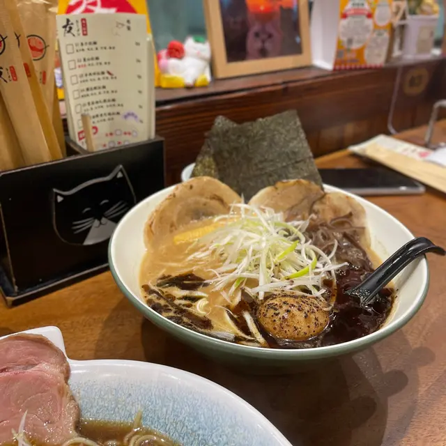 主打日式拉麵嘅店,室內環境好有氣氛,好多貓貓嘅相好可愛!店內有多款唔同口味嘅拉麵,仲可以揀曲面同直面,兩種麵都好好味,曲面掛湯啲,直面爽口😆叉燒都有得揀,有得揀慢煮叉燒或者火炙豚肉今次試咗辛肉碎拉麵同黑蒜油拉麵,愛食辣嘅人一定要試佢嘅辣拉麵,因為真係好惹味好辣!過癮!另外仲叫咗兩款小食,最推介蜜糖雞翼,真係整得好好味,出面鋪滿芝麻勁香以下是圖中菜式及參考價錢💵・ 辛肉碎拉麵 ($88)・ 黑蒜油拉麵 ($89)・ 炸棒棒餃子 ($33)・ 蜜糖雞翼 ($38)…查看更多