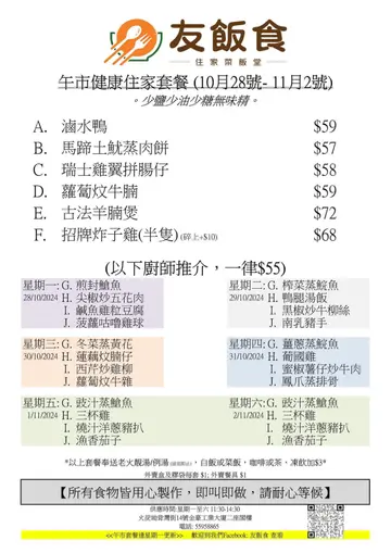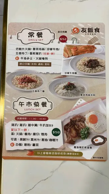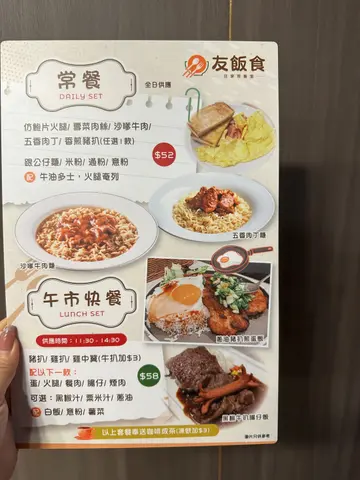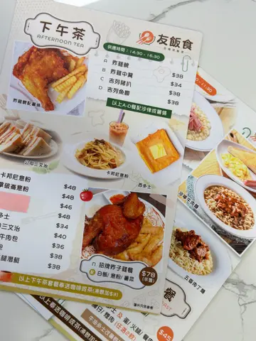 今日經過火炭區做嘢,感恩順利地提早做晒啲嘢,一於食個獎勵吓自己😆行過見到呢一間 「友飯食」 寫住下午茶都有做折扣,咁就想去幫襯吓先! 第一次嚟到,見到個環境都好大好企理好舒服,唔似一般茶記咁,第一印象已經好好👍我哋兩個人叫咗兩份茶餐,吉列豬扒拼沙律,西多士跟凍檸茶。 好大份喎! 🌟吉列豬扒拼雜果沙律個吉列豬扒好大份,炸得好脆,完全唔會太厚粉,沙津係我兒時最鍾意食嗰啲雜果沙律,滿滿嘅回憶出晒嚟,豬扒配埋沙律醬,完美滿分嘅配搭👍🌟西多士跟凍檸茶呢個係香港人解壓3點3,必備嘅item。 個西多士好大份,大過我手掌,上面配埋一嚿牛油再加埋糖漿,正! 你再配埋凍檸茶,好香檸檬味😆整體嚟講呢間餐廳嘅質素都唔錯,全部都好正常發揮,最有驚喜嘅係份量好大,價錢又有折扣! 抵食👍…查看更多