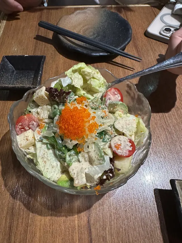 古今工位於官塘工業中心4期觀塘站一出就到, 比行去鴻圖道工廠區仲要方便餐廳是平民式日本菜,每款菜式都是幾十蚊, 而且款式超多,日日食都有排不重複。絕對可以做觀塘人飯堂日式麻醬豆腐沙律 滑滑的豆腐有濃濃嘅豆香,甜甜麻醬再伴以黑白芝麻提昇香氣。 中間仲有中華沙律🥗。沙律菜很新鮮清爽。成個沙律清新又健康。連甚少食菜的阿女都食左唔少
