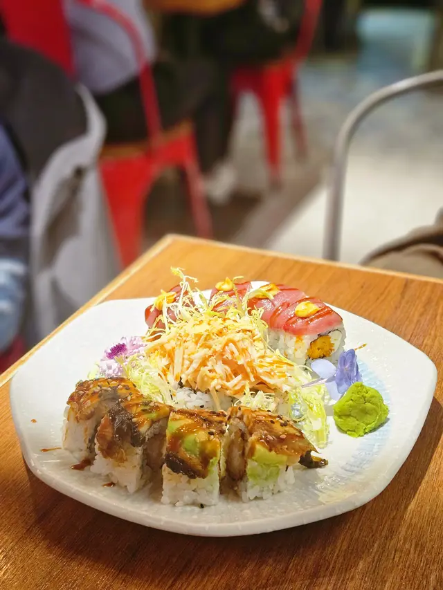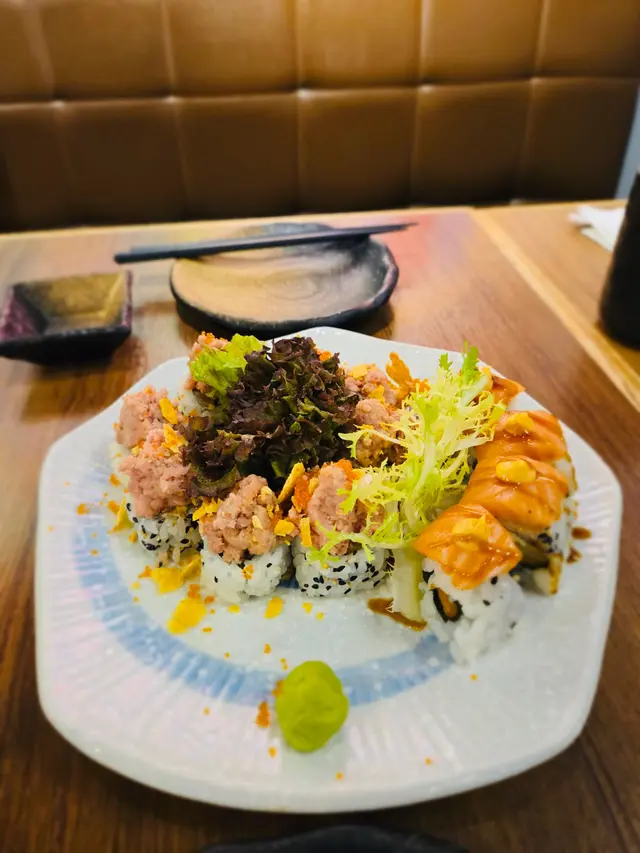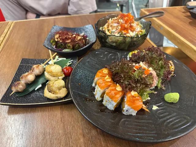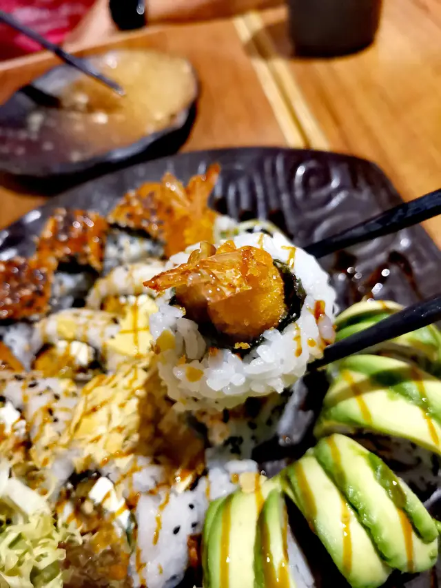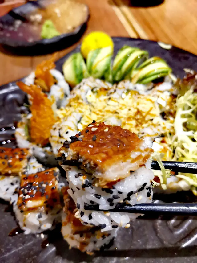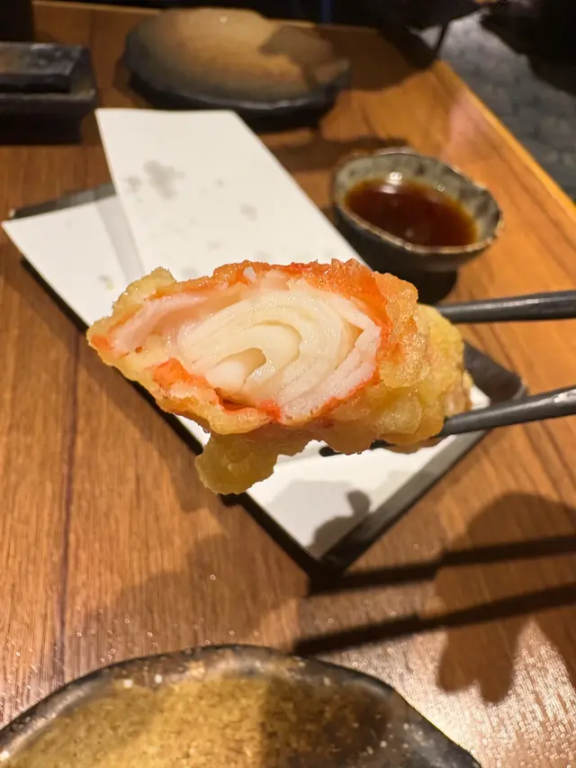 天婦羅有炸蝦,甜薯和釀秋葵最讚是外表夠哂香脆但一d 都唔油,而且炸粉是薄薄一層,唔會食到成口粉。最驚喜是秋葵入面釀左肉, 好得意😊燒物就叫左2款特別推介黑豚豬頸肉串燒入口好爽脆,連d肥筋位都係爽的。 比平時嘅串燒豬好食10倍,必點item 另一款鹽燒雞中翼將雞翼中間剪開再燒燒得均勻又食得方便。 個皮燒到脆脆架古今二嘅卷物超多選擇,而且d名同組合好有創意黑龍卷外表真係成條黑龍咁呀 由鰻魚,炸蟹柳,芝士同牛油果組成煙花由辣味三文魚,辣味吞拿魚同脆片組成脆片造出煙花嘅閃爍感,好有諗頭。入口有軟有脆,口感豐富午夜牛郎由三文魚,牛油果同芝士組成外層包住脆脆,口感好新奇但點解叫午夜牛郎,我仲未參透到
