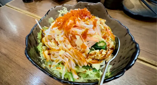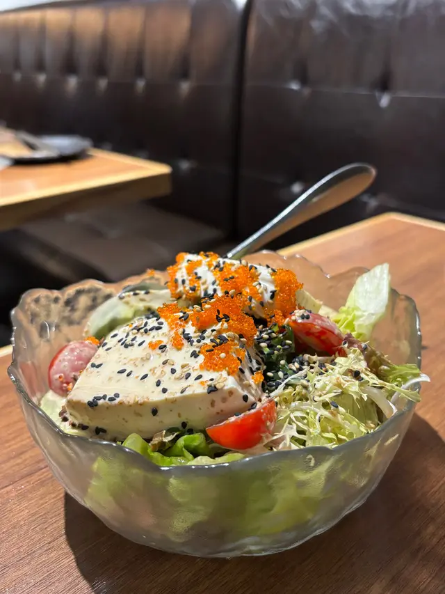 古今工位於官塘工業中心4期觀塘站一出就到, 比行去鴻圖道工廠區仲要方便餐廳是平民式日本菜,每款菜式都是幾十蚊, 而且款式超多,日日食都有排不重複。絕對可以做觀塘人飯堂日式麻醬豆腐沙律 滑滑的豆腐有濃濃嘅豆香,甜甜麻醬再伴以黑白芝麻提昇香氣。 中間仲有中華沙律🥗。沙律菜很新鮮清爽。成個沙律清新又健康。連甚少食菜的阿女都食左唔少