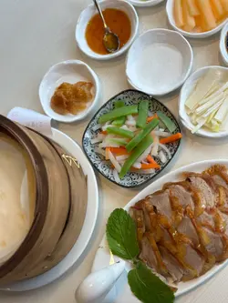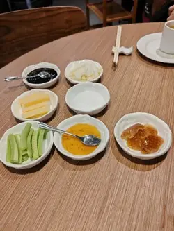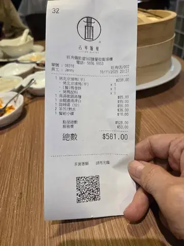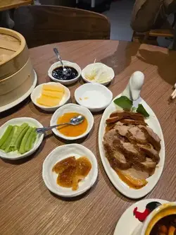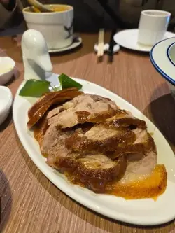 這間烤鴨餐廳最近新開張,只要訂座便每枱免費送半隻烤鴨,於是今天晚上便和朋友一起來吃晚餐。烤北京填鴨:朋友想喝鴨湯,於是我們便點多半份烤鴨套餐,配冬瓜鴨架湯。之前網上看見烤鴨是在客人面前切的,但今次是直接已切好再給我們。烤鴨都算肥瘦適中,而且肉質都算嫩滑,美中不足只是微暖,並不是熱騰騰的,至於鴨湯鹹鹹的味道不錯,挺好喝的。風味松子魚:北京菜除了烤鴨,松子魚亦是我的最愛,可惜松子魚雖然是叫炸,但是脆皮太厚而且很硬,最重要是醬汁甜得嗆喉,正常甜酸醬應該是酸酸甜甜,而這份只得甜膩的味道,真的很難吃。鐵板蔥爆羊肉:另外羊肉亦是我的至愛,這間羊肉的膻味都算濃郁,適合喜愛羊膻味的朋友,醬汁的調味亦相當不錯,如果羊肉份量多一點便更好了。意大利黑醋骨:黑醋骨的份量很少,而且只是微暖,最重要是調味不好吃,大家可以不用點。南翔小籠包:小籠包的皮略為有點厚,湯汁亦不多,幸好豬肉都算鮮美多汁,味道還算不錯吧。瑤柱蛋白炒飯:炒飯比較乾身一些,而且米粒比較硬,不過炒得都算有鑊氣,而且鹹鹹的味道不錯。高力豆沙香蕉:朋友說這是北京菜的著名甜品,是用蛋白製作而成,不過內裡的香蕉餡料只有很少,至於蛋白沒有什麼味道,個人認為味道只是一般。價錢方面,餐廳設有加一服務費和茶位費,四人總共 $1416。總結來說,餐廳的冷氣不夠涼快,食物味道雖然不算出色,但還算可以吧,價錢則中規中矩,不過新開張優惠送半隻烤鴨挺划算的。…查看更多