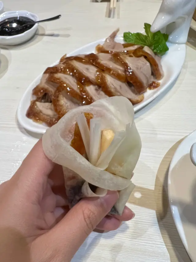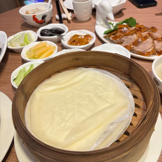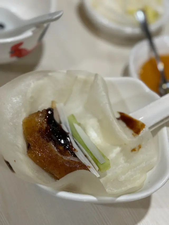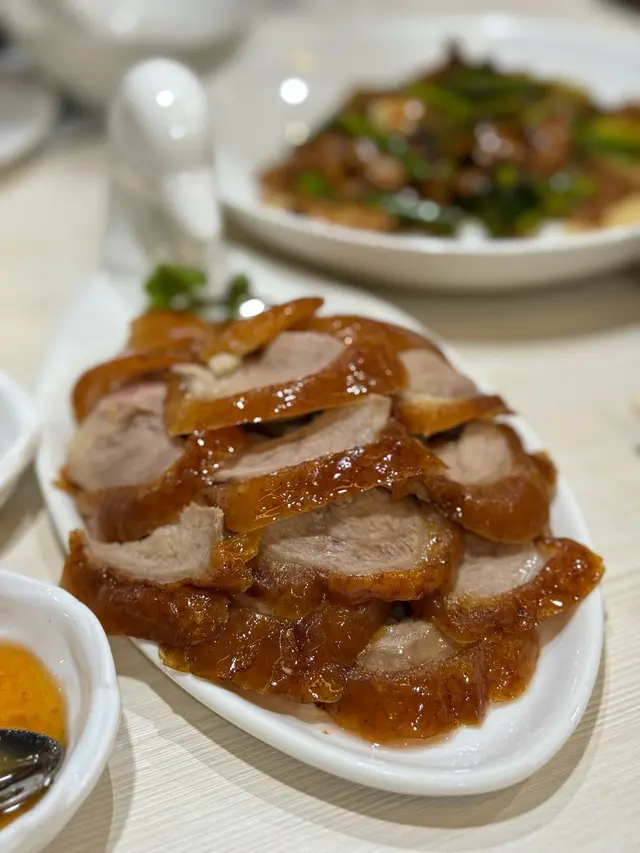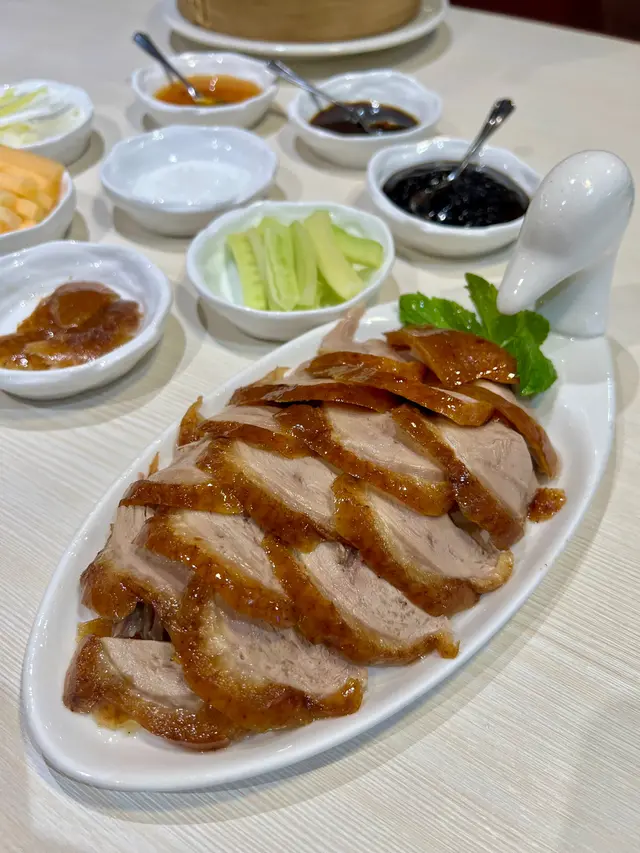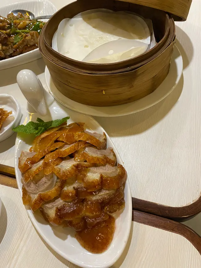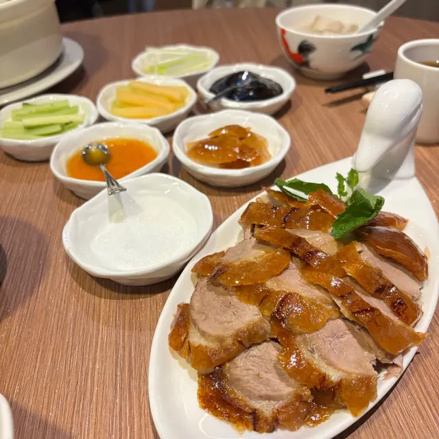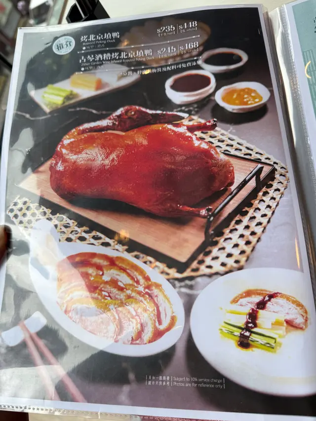 這間烤鴨餐廳最近新開張,只要訂座便每枱免費送半隻烤鴨,於是今天晚上便和朋友一起來吃晚餐。烤北京填鴨:朋友想喝鴨湯,於是我們便點多半份烤鴨套餐,配冬瓜鴨架湯。之前網上看見烤鴨是在客人面前切的,但今次是直接已切好再給我們。烤鴨都算肥瘦適中,而且肉質都算嫩滑,美中不足只是微暖,並不是熱騰騰的,至於鴨湯鹹鹹的味道不錯,挺好喝的。風味松子魚:北京菜除了烤鴨,松子魚亦是我的最愛,可惜松子魚雖然是叫炸,但是脆皮太厚而且很硬,最重要是醬汁甜得嗆喉,正常甜酸醬應該是酸酸甜甜,而這份只得甜膩的味道,真的很難吃。鐵板蔥爆羊肉:另外羊肉亦是我的至愛,這間羊肉的膻味都算濃郁,適合喜愛羊膻味的朋友,醬汁的調味亦相當不錯,如果羊肉份量多一點便更好了。意大利黑醋骨:黑醋骨的份量很少,而且只是微暖,最重要是調味不好吃,大家可以不用點。南翔小籠包:小籠包的皮略為有點厚,湯汁亦不多,幸好豬肉都算鮮美多汁,味道還算不錯吧。瑤柱蛋白炒飯:炒飯比較乾身一些,而且米粒比較硬,不過炒得都算有鑊氣,而且鹹鹹的味道不錯。高力豆沙香蕉:朋友說這是北京菜的著名甜品,是用蛋白製作而成,不過內裡的香蕉餡料只有很少,至於蛋白沒有什麼味道,個人認為味道只是一般。價錢方面,餐廳設有加一服務費和茶位費,四人總共 $1416。總結來說,餐廳的冷氣不夠涼快,食物味道雖然不算出色,但還算可以吧,價錢則中規中矩,不過新開張優惠送半隻烤鴨挺划算的。…查看更多