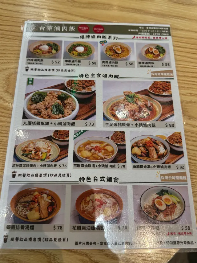 The restaurant is located close lo tak food court in MTR Tsuen Wan proximity. It earned a Michelin recommendation in 2024 and 2025. They have all the classic Taiwanese dishes. We ordered five dishes for take away. The waiting time in the evening was 20 minutes. The service was nice. The dishes are all very tasty besides the tempura, which was cold and a bit „hard“ in consistency. Nothing like Japanese tempura. Maybe it’s just not the doh to order for take away.Our favorite dishes were the braised pork rice with marinated egg. Here especially the pickles. The price was rather low for the quality of the dishes. The total amount was around 240$ for 5 dishes. We would certainly go back as it’s one of the best Taiwanese restaurants in Tsuen wan. However we would dine in and not take away.…查看更多