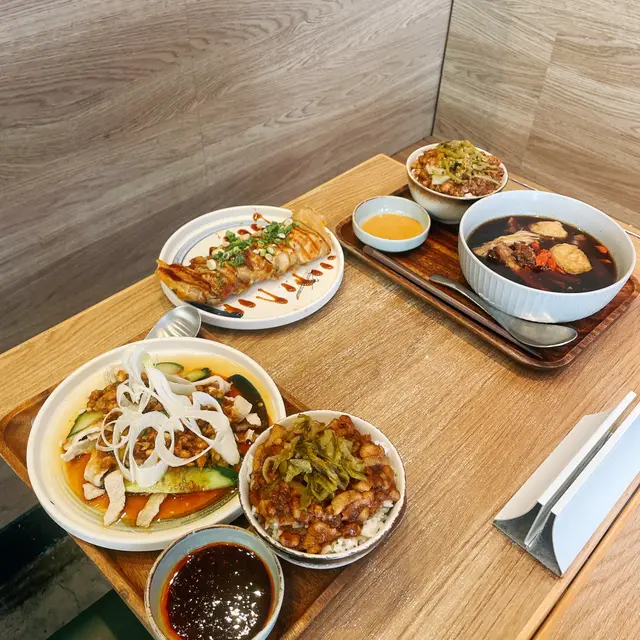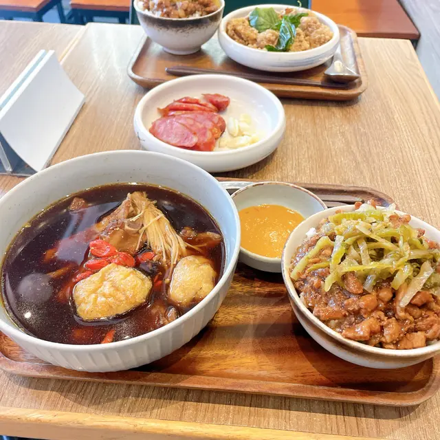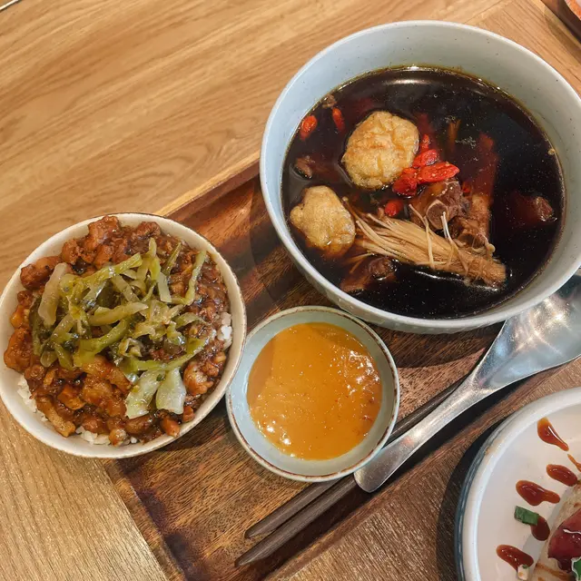 推開玻璃門,撲面而來是滷汁的醬香夾著淡淡藥膳味,燈光黃澄澄的像台灣夜市攤位的鎢絲燈💡。店裡牆上貼著手寫菜單和復古電影海報,桌椅排得緊密但不擁擠,隔壁桌大叔吸溜著麵線的聲音莫名親切。我和男友擠在角落的雙人座,金屬托盤擺上來那刻,忽然覺得自己像在台北巷口快餐店打工的高中生👩‍🎨。藥膳排骨湯餐+小碗滷肉飯 🌟7/10排骨給得大方,四塊帶軟骨的肉排沉在深褐色湯裡,當歸和枸杞香氣明顯但不會苦澀,喝到最後有點鹹。滷肉飯的肥瘦比例剛好,醬色油亮亮的,可惜米飯偏軟黏,要是用台灣蓬萊米就更好了🍚。男生吃可能得加飯,這份量對我剛好。花雕麻油雞湯+小碗滷肉飯 🌟8/10湯面浮著金黃麻油珠,酒香濃得喝完臉頰微熱🍶。雞腿肉煮到用筷子一撥就散,薑絲切得細細的咬到會突然辣一下。滷肉飯同款問題,但滷汁拌開後還是忍不住把碗刮乾淨。男友說這碗湯讓他想起他阿嬤的月子餐(?)甜不辣 🌟6.5/10現炸的魚漿條外皮酥脆,咬開會噴蒸氣🔥,但粉感偏重,少了台灣路邊攤那種Q彈魚香。附的甜辣醬是台式經典配方,沾著吃至少解了三分鄉愁。  茉香仙草奶茶 🌟7.5/10 仙草凍給得豪邁,吸管插下去會卡住的那種🍮。奶茶甜度剛好,茉莉茶香很清新,可惜冰塊佔了半杯,喝到最後味道淡得像在喝香水尾調⋯⋯總結這頓飯就像遇見一個講廣東話的台灣朋友——熟悉中帶點異地適應的趣味💫。藥膳湯的暖、麻油雞的醇,連同那些小缺陷,都成了思鄉胃的安慰劑。臨走前看到老闆娘在切滷蛋,那醬色讓我偷偷咽了下口水。查看更多