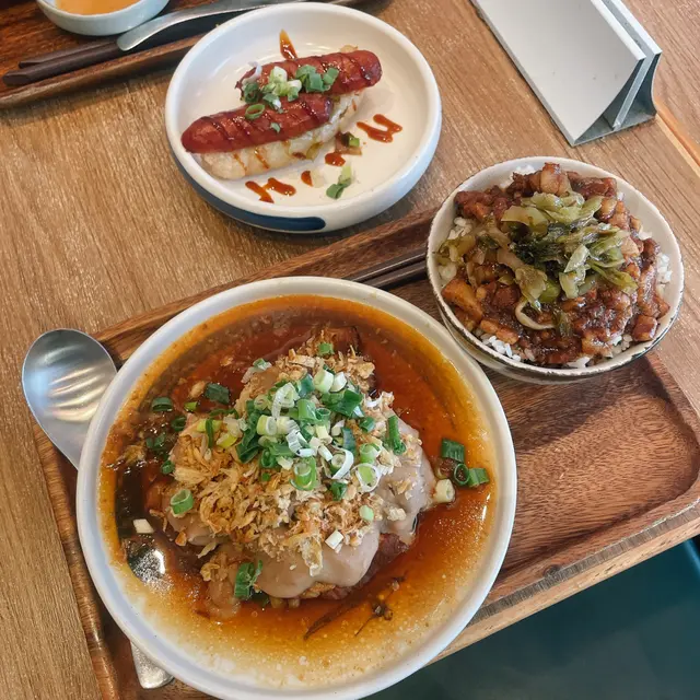 上星期六同老公喺荃灣做完嘢,經過街角見到間「台蔡滷肉飯」,門口掛住盞暖黃燈💡,木枱膠櫈擺得齊齊整整,似足台灣街邊嗰種「無乜裝修但好有人氣」嘅小店。冷氣夠凍🥶,但唔會吹到人頭痛,隔籬枱一家大細傾緊聽日去邊度玩,阿姐拎住壺茶邊行邊同熟客吹水,成個氣氛就係「返屋企食飯」咁自在。🍖芋泥豬軟骨+小碗滷肉飯 👍🏻👍🏻👍🏻👍🏻豬軟骨煮到筷子一夾就散,個滷汁甜得嚟帶少少八角香,最正係底層嗰pat紫薯蓉🍠,綿滑得嚟溝埋肉汁食,鹹甜交錯好過癮!滷肉飯嘅肥瘦比例啱啱好,飯粒吸晒醬油香,不過碗仔細細,男仔可能要加飯先夠喉。🍲藥膳排骨湯餐+小碗滷肉飯 👍🏻👍🏻👍🏻個湯飲落有當歸枸杞味但唔苦,排骨燉到離骨得嚟仲保留到肉質,飲完成個胃暖笠笠☕️。不過藥材味同滷肉飯夾埋有少少撞,下次可能配白飯會更夾。🌭大腸包小腸 👍🏻👍🏻👍🏻👍🏻  糯米腸外皮煎到脆卜卜,包住條油香爆棚嘅台式香腸,面頭灑咗啲花生碎🥜同酸菜,咬落「咔嚓」聲同軟糯感一齊攻陷個口,邪惡但停唔到口!略嫌香腸偏鹹,要啜啖凍冬瓜茶中和下先得。整體嚟講係街坊價錢但交足貨,豬軟骨同大腸包小腸特別有記憶點,經過荃灣想食飽肚又唔使諗嘅話,呢度啲套餐夠晒穩陣👌🏻。埋單嗰陣見到外賣阿姐摺緊滷味盒,諗緊下次試埋佢啲滷水拼盤先得~查看更多