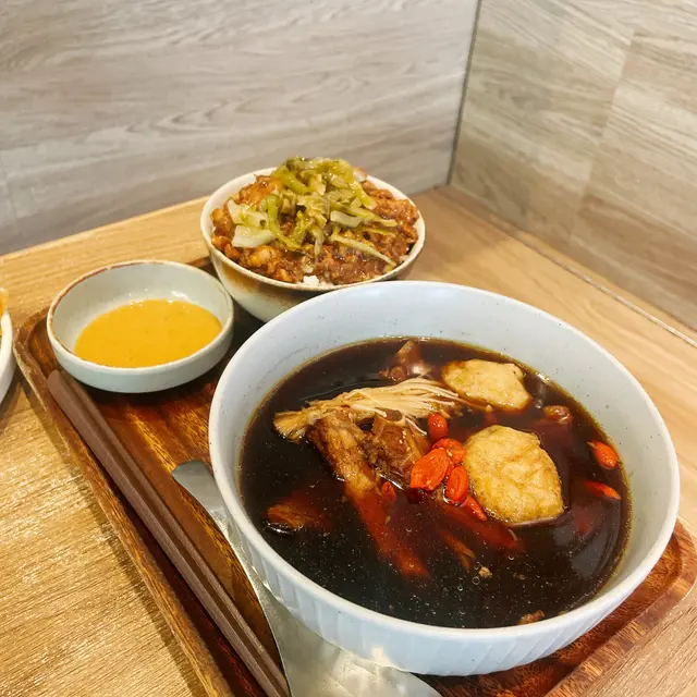 同老公拍拖日,諗起台灣旅行嘅味道,就殺入荃灣「台蔡滷肉飯」試吓晚餐。餐廳裝修簡潔,木系枱凳配暖黃燈光,有啲似台灣街邊小店嘅feel 🏮。雖然唔算大,但坐得舒服,牆上掛住啲台灣風景相,幾有親切感。週末夜晚人流適中,唔會太嘈,啱晒兩公婆慢慢食傾偈 🗣️💕。芋泥豬軟骨+小碗滷肉飯 ⭐️⭐️⭐️⭐豬軟骨煮到超淋,一咬就散開,芋泥香甜綿密,撈飯食好夾!滷肉飯嘅肥瘦比例啱啱好,醬汁濃郁但唔會過鹹,唯一係飯量偏少,男仔可能唔夠飽 😅。花雕麻油雞湯+小碗滷肉飯 ⭐️⭐️⭐️⭐️✨雞湯酒香突出,麻油味溫和唔膩,飲完成個身暖笠笠 ☺️🔥。雞肉嫩滑,仲有啲杞子同紅棗,感覺幾滋補。滷肉飯同上一樣水準,呢個set絕對係凍天首選!百香果鳳梨烏龍茶+寒天 ⭐️⭐️⭐️✨茶底清新,百香果同鳳梨嘅酸甜幾開胃,寒天咬落爽口。不過甜度固定,如果再少糖啲會更啱我口味 🍍💦。呢餐食得好滿足,價錢合理(人均$100左右),味道有台灣地道嘅七八成功力。特別推介麻油雞湯,秋冬食真係冇得輸 ❄️👍。如果經過荃灣想食台式,可以試吓~查看更多