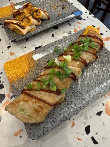 與一班朋友在附近做完運動,到這餐廳聚一聚聊聊天。四時後才進店,食客不多,選了一列長檯坐下。這店賣台式食品,下午茶花樣也不少,精選三重湊,有三款食物任配搭,又有多款蛋餅可選,另有十款可追加的小食,適合貪心的人。我們六人點了三份蛋餅和一份麵加些小吃共品嚐。小食要了黃金豆腐和甘梅地瓜。豆腐炸得很乾身,像臭豆腐的質感,內軟外脆,不過沒有什麼味道,店員拿了些孜然粉給我們,這樣伴吃才有點味道。地瓜也是炸過的,不過地瓜本身有甜味,所以吃起來香甜脆口,味道不錯。蛋餅是台式食物最普遍的食物之一,今次我們要了三款。台灣蔥油餅,不用太多配料,只是用蔥勻和在餅皮內煎得便可,一大片圓型蔥油餅切開八件上檯,餅底不厚,口感軟糯又酥香。芋泥肉鬆蛋餅,切開有六件,每件都醮上了甜醬,餅皮內卷上了綿密的芋蓉、蛋皮和肉鬆,口感充實。牛肉蔥捲餅,長條型的捲餅上檯時已切開四份,餅內蔥和牛肉片滿滿,同樣在餅面醮上甜醬,牛肉片腍滑易吃。麻醬雞絲麵,是一款拌麵沒有湯的。麵內材料有花生碎,青瓜絲和雞肉絲,白芝麻。麵內有麻醬,把所有材料和麵條拌勻就可吃。麵條彈牙,青瓜絲爽口,醬汁味適中。台式食品還是最喜歡吃蛋餅。