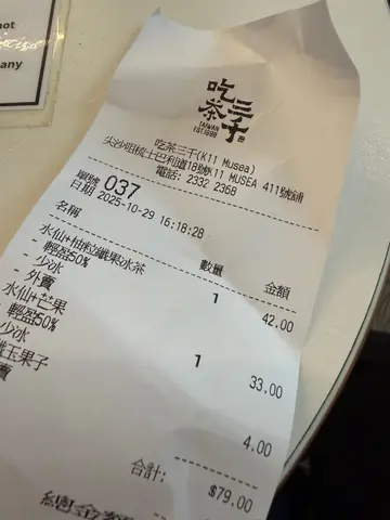 在尖沙咀k11 Musea 行街,行到口渴就諗到「吃茶三千」,環境都幾唔好,設有好多枱凳供顧客休息,落單坐低都幾舒服,啱晒行街行攰想坐低飲嘢嘅人。佢哋近排推出咗葡萄柚系列,台灣直送,限量發售150杯。我哋揀咗柚粒纖果冰茶,用水仙桂花茶底,葡萄柚果露、葡萄柚果粒、纖玉果子,可以設定輕盈50%糖同少冰,飲落清新唔會太甜膩。柚粒帶嚟啲微酸同淡淡嘅果香,與水仙茶嘅花香融合得好好,令整杯茶更有層次感,好開胃又爽口。柚子嘅鮮甜同水仙茶嘅醇厚味道好好平衡,好冧又好refresh。另一杯水仙+芒果都唔錯,芒果香味濃郁,茶底依然保持住清雅,芒果果肉細緻嫩滑,糖度輕盈正好帶出芒果嘅鮮甜,水仙茶底唔會太膩、飲落甘香爽口。依家佢哋做緊雙十一限時優惠。10號凡以正價購買一杯飲品可以HK$11加購一杯「水仙芒果茶」11號凡以正價購買一杯飲品可以HK$11加購一杯「決明子百花香蜜」12號凡以正價購買一杯飲品可加配任何一款配料只需HK$2(數量不限,特別飲品不能加配)…查看更多