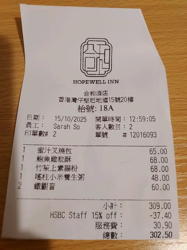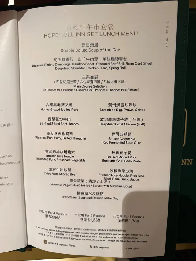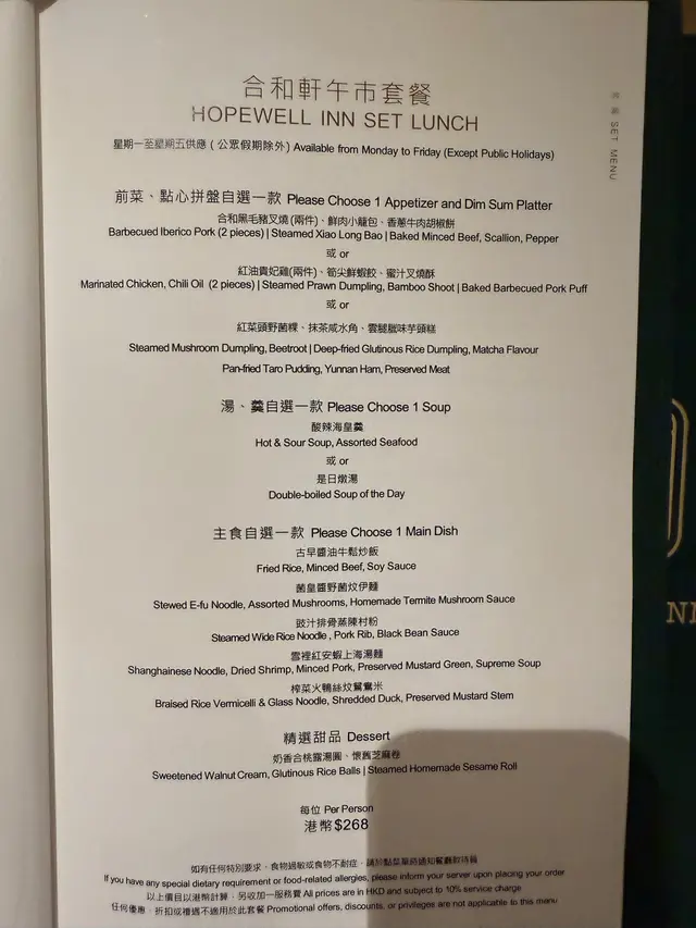 經常試新的餐廳,今次友人提議到合和軒。餐廳環境雅致,予人高檔舒適的感覺。午市套餐包括有湯品、點心、飯麵以及甜品。兩款湯分別為菜膽花菇燉雞腳與瑤柱海皇豆腐羹。兩者之間以燉雞腳較為鮮美,湯底清澈甜潤,喝下滋潤舒服。三款點心有素潮州粉果、蜜汁叉燒包和松露野菜素春卷。素粉果跟普通粉果幾乎一樣,口感太過糯。叉燒包不過爾爾,最有印象的是松露素春卷,起碼松露味突顯。接著的松露野菌醬素菜炒飯跟金銀蛋肉鬆炒飯皆炒得粒粒分明,前者有松露香的優勢,但亦蓋過了其他食材的味道。後者的金銀蛋沒多少作用,反為肉鬆可帶出鹹中帶甜的食味。甜品方面,陳皮蓮子紅豆沙是煲得夠綿的,然而陳皮的味道過於霸道,有些過份。糖水裡有一顆湯丸似的圓波,沒甚麼味道,可有可無。芝麻卷好實,未夠彈性。一個午餐二百六十八個大洋,價錢與食物都屬中等水平。…查看更多