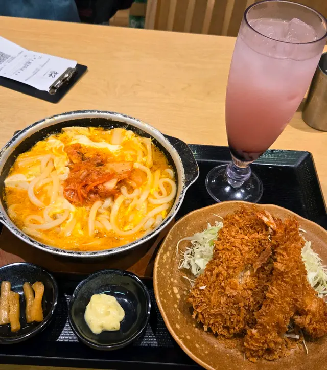 旺角沙田油麻地荃灣都有分店今次去葵廣唔掃街 想坐低食嘢成日都見呢間吉豚屋 餐牌都幾吸引今次就入去試吓!有好多唔同定食見佢最近仲有個$55 3餸飯內用要加一 定食就包湯同前菜但係唔包嘢飲 不過嘢飲都可以有套餐價特製柚子乳酸 ($13)勁甜!😵‍💫 乳酸味比較重 唔好飲❌吉列炸蝦豬扒泡菜湯烏冬鍋 ($82)前菜係甘味醬油蘿蔔漬 鹹鹹哋 ok啦有兩件炸蝦同一塊吉豬 仲有伴椰菜絲吉豬冇切開有d難去食 不過味道都ok吉列蝦先係最好食!勁脆 個炸粉好夠味烏冬鍋好大份 泡菜湯都辣辣地烏冬口感唔錯 幾煙韌 仲有豆腐勁豐富 勁飽 對得住價錢😌👌🏼鐵板滑蛋吉列雞扒鰻魚定食 ($99)前菜一樣 另外有個野菜豚肉湯普通 唔係特別好飲鰻魚幾滑 有少少骨 但吉列雞扒冧哂淋左個滑蛋上去 食唔到個香脆個汁係類似壽喜燒汁個炸粉索晒個汁 勁甜 太甜啦愈食愈漏 麻麻地😟呢間嘢都係食炸嘢好 冧左就唔好食😂查看更多
