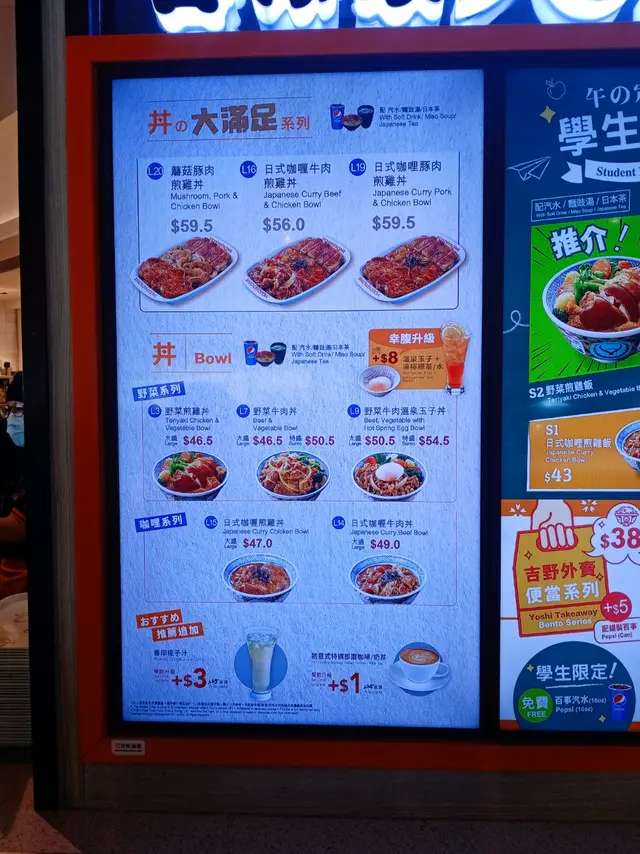 吉野家 (又一城) (九龍塘) 網址: https://s.openrice.com/QrbS0nZa000 地址: 香港九龍塘達之路80號又一城L2樓L2-26號舖 電話: +852 22658805