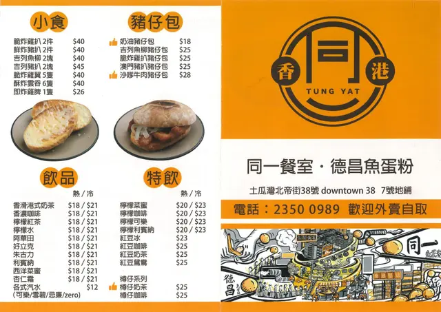 同一餐室 (土瓜灣) 網址: https://s.openrice.com/QrbS0sXaB00 地址: 香港土瓜灣北帝街38號Downtown 38地下7號舖 電話: +852 23500989