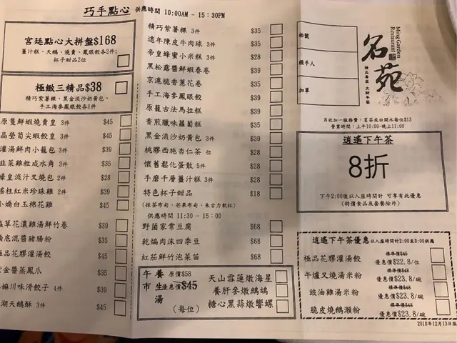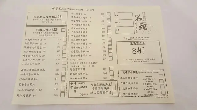 西式下午茶就成日食,但係呢間名苑酒家佢就諗咗一個中式下午茶出嚟。話明係中式下午茶,就梗係唔會用傳統嘅西式三層架,反而佢哋用用咗一個縮細版嘅中式裝飾櫃,上邊放唔同嘅點心,再另外配傳統嘅中式茶,真係唔能夠唔讚佢哋有心思。下午茶食物包括天鵝酥、燒賣、綠茶或者芒果布甸、紅棗糕等等。味道同平時飲茶叫嘅點心非常類似,不過色香味呢三點,佢用呢個方法嚟擺點心,色呢一點嘅評分絕對係比放喺一個一個蒸籠上邊高好多。價錢亦都合理,所以都係值得一試。…查看更多