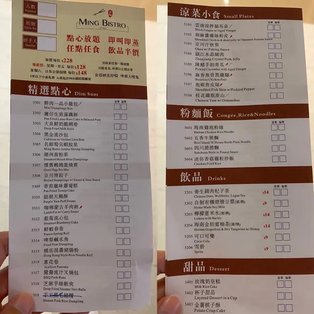📍#名館📍Ming Bistro 🇭🇰香港銅鑼灣軒尼詩道500號希慎廣場14樓1401號舖🇭🇰Shop 1401, 14/F, Hysan Place, 500 Hennessy Road, Causeway Bay, HK🌐銅鑼灣 🌐中環 🌐紅磡人均消費: HKD180味道: 👅👅👅👅賣相: 👀👀👀👀價格: 💰💰💰💰環境: 🌹🌹🌹🌹服務: 👨🏻性價比: ⭐️⭐️⭐️⭐️回頭率: 🔆🔆🔆本來想去中環分店試試十三么甜品,因時間關係去不了,就去了銅鑼灣分店,誰知沒有十三么甜品😂😂餐廳在希慎14樓,尚算方便!環境十分開陽,坐窗邊可以俯瞰銅鑼灣下午時段有點心放題,$168/位,不過看過點餐只好決定還是散點好了😅⭐️紅燒嫩滑妙齡鴿🐥$58乳鴿賣相和平時食的差不多,燒得紅噹噹很靚肉質的確十分嫩滑,而且乳鴿味道香濃惹味,食得舔舔脷🆗芝麻醬雞絲粉皮🍝$58芝麻醬雞絲粉皮的醬汁我覺得是OK中規中矩的問題在於粉皮跟平時吃的有點不一樣,粉皮比較厚身,比河粉更厚,口感不太好花生碎很多,但青瓜太少了⭐️鎮江水晶餚肉🐷$48水晶餚肉都不錯,裏面的餚肉肉味重,十分香口,啫喱位置如果味道可以更香濃就較為理想啫喱位置看到好像百福豆腐盒的形狀,影響觀感😂😂😂⭐️灌湯鮮肉小籠包🥟$68小籠包$68有五隻,都不算貴看起來十分乾,沒有水份似的,但其實裏面真的有好多湯!味道不錯,可惜上枱時只是和暖,不夠熱💯咖喱蒙古羊肉餅🥠$58明明說是羊肉餅,我一直以為是類似清真牛肉餅那種😂😂😂其實只是一層一層的薄餅,羊肉就吃不出來了,但值得一試是咖喱味超級香,一份有差不多二十片左右,十分抵吃⭐️宮庭點心盤🍱$128十三么麻雀甜品就吃不到了,就來個比較養眼一點的宮廷點心盤🤩 點心房一共有五款食物:🔴名館筍尖蝦餃皇:蝦餃肥美,外皮煙煙韌韌,蝦味香濃🟠野菌冬菇包: 個包真的做得非常非常似冬菇!而且非常軟!裏面係有點像齋菜的餡,十分好味🟡天鵝紫薯酥靚靚天鵝紫薯酥!紫薯酥超級鬆化!裏面紫薯勁香勁軟!🟢網紅小白兔得意小白兔,可惜兩粒黑芝麻放得不好,變得楚楚可憐!小白兔咬起來十分煙韌,似是用糯米做的,但有美味的椰香🔵綠茶慕絲慕絲口感十分滑,綠茶味不會太重,適合不饞甜的人⭐️橋底混醬豬腸粉🥢$38看起來沒有平時的腸粉那麼吸引,但想不起混醬起來又十分惹味雖然位於銅鑼灣,但食物出品水準和擺設設計都算出色,性價比頗高!但服務態度就真的嬲到爆炸!1. 我們坐在外面,但沒有一個員工是在外面的,每次找人都花勁多時間2. 分別找了三個員工要一杯暖水,結果要第四次才有3. 我把點心紙和筆放在另一張櫈上,有個員工竟然用非常鄙視的眼神問我為什麼放在這裏,然後他收走了4. 因為想再加單,唯有問員工在拿點心紙,結果到時沒有給我的我一向對於餐廳服務態度沒有太大要求,只求中規中矩,今次真的真的十分不舒服,所以回頭率略減!…查看更多