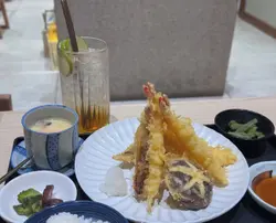 跟好姊妹👭去做facial💆♀️之前先去食個簡單晚餐,在銅鑼灣登龍街見到「味一食堂 Yummy House」門面光猛簡潔,就入去試下😊餐廳內裡裝潢以日式簡約設計為主,環境舒適,坐得也舒服,主要提供多款定食例如咖哩飯、烏冬、意粉、丼飯等,總有一款合你口味😁海老穴子沙𩺬魚天婦羅定食 $118這個定食🍱包括前菜、蟹肉蒸蛋🦀🥚、鹹菜、白飯🍚及味噌湯,更以優惠價$18加配了蜂蜜青檸梳打🍯🍋🟩🥤天婦羅有大蝦🍤、穴子🐟、沙𩺬魚🐟及茄子🍆,穴子肉質綿密細嫩帶微甜,沙𩺬魚肉質清爽,整體天婦羅口感酥脆不油膩,吃前蘸一點秘製的天婦羅醬汁,味道微甜,非常惹味🤩鹿兒島產黑豚肉稻庭烏冬 $98定食🍱包括前菜及小食,我同樣以優惠價$18加配了白桃梳打🍑🥤😊小食是香脆可口的日式炸雞🐔,黑豚肉以薄片涮煮🐷,肉質鮮嫰,口感嫰滑,份量足夠,配料還有海帶及魚板,配搭煙韌軟滑的稻庭烏冬🍜及清甜的醬油湯底,非常惹味🤍…查看更多