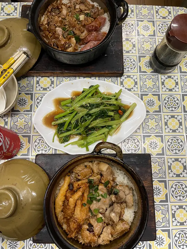 來到元朗一定要去試吓人氣炭火燒煲仔飯,尋日吾系太多人👍🏻排左一陣隊就可以😌食到,店其實系好細只有4張枱,家庭式經營人手有限所以大家要等 ~鳯爪排骨煲仔飯 ~梅菜排骨臘腸煲仔飯 ~馬拉盞炒通菜下次再到元朗會再去食,支持小店❤️😋查看更多