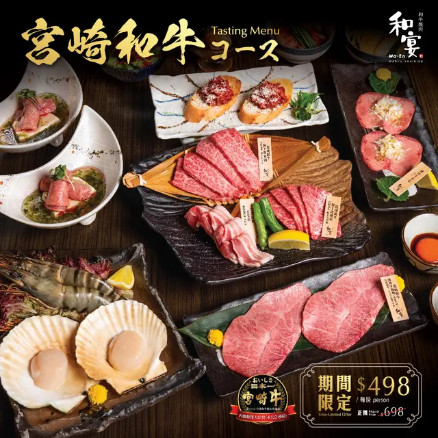 兩度榮獲米芝蓮指南推介的「和宴 Wa-EN」,呈獻全新升級版【宮崎和牛海鮮盛宴】。是次菜單嚴選更多宮崎牛的珍稀部位,份量亦再度提升,價格維持$498,讓您專注品味極致和牛之韻。嚴選有「日本一」美譽的宮崎牛:前菜以「輕涮薄切西冷」與「和牛他他配芝士及法包」揭開序幕;其後陸續奉上稀有部位宮崎牛牛板腱配日本蛋、特上里脊肉、特上肉眼芯及時令海鮮等。從前菜至甜品,每道皆由廚藝團隊匠心設計,旨在純粹展現頂級食材的天然魅力。資深餐廳團隊以專業細緻的服務,為您締造難忘的用餐體驗。