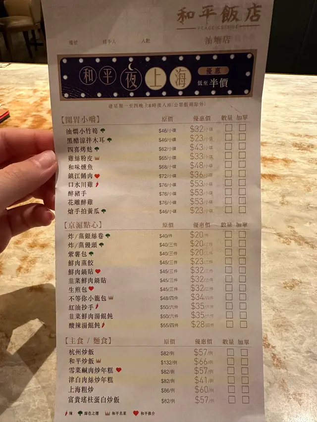 ### **🍖 東坡肉亮點 & 價格分析**1. **經典功夫菜** - 和平飯店作為老牌酒店,東坡肉大概率是傳統做法: ✅ **肥瘦分層**:五花肉三肥兩瘦,燉到顫巍巍的琥珀色。 ✅ **醬香濃郁**:醬油、黃酒、冰糖慢火收汁,可能帶淡淡桂皮或梅乾菜香。 ✅ **外賣包裝**:建議確認是否分裝醬汁(防坨)或配饅頭/米飯。 2. **折扣力度** - **原價98元 → 折後58元**(省40元),相當於單點一碗麵錢吃硬菜! - 對比其他高端酒店(如杭州四季酒店金沙廳東坡肉約198元/位),這價很親民。 ---### **⚠️ 外賣自取小貼士** 1. **口感保持** - 東坡肉最怕涼後油膩,建議: 🔥 到家立刻微波加熱20秒,或隔水蒸5分鐘恢復軟糯。 🍚 自備熱米飯/荷葉餅吸汁,靈魂是醬汁別浪費! …查看更多