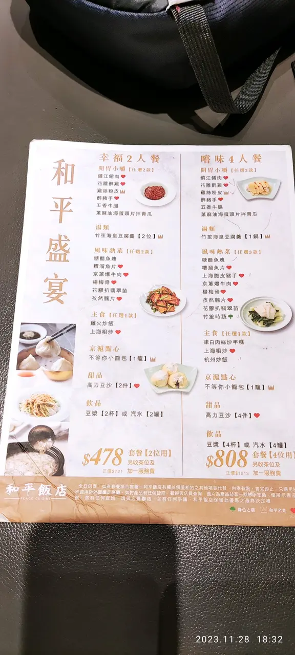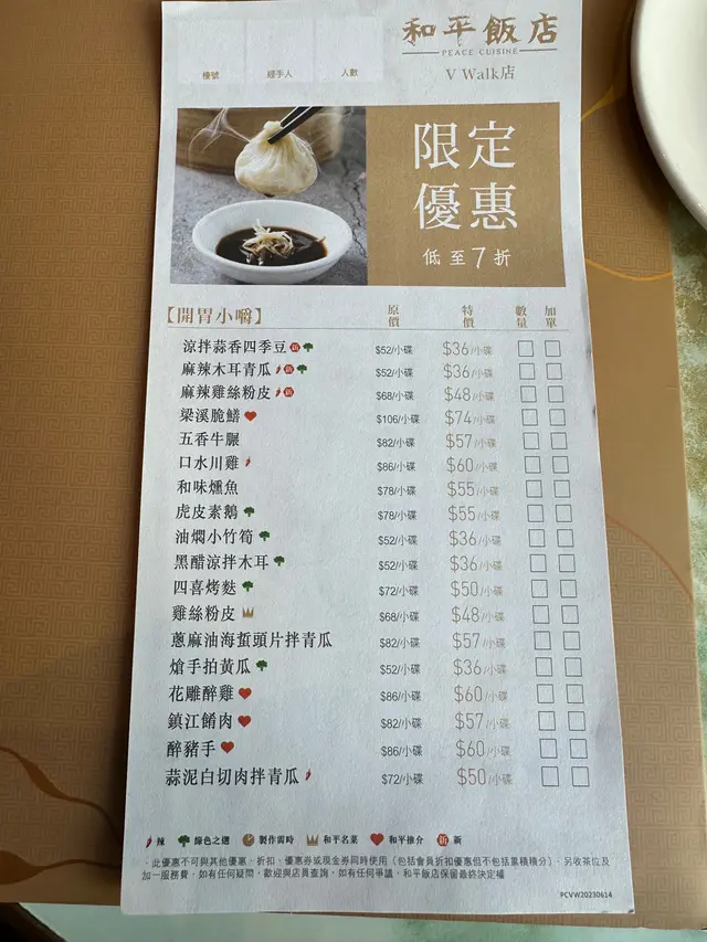今天與三位朋友一行四人來到了V Walk的和平飯館試一試。點了幾道菜來分享:- **鱔糊**:鱔魚滑嫩,醬汁濃郁,但味道偏甜了一些。- **上海粗炒**:麵條彈牙,蔬菜新鮮,整體口感不錯。- **麻婆豆腐**:豆腐軟嫩,辣度適中,但麻味稍微不足。- **小籠包**:皮薄餡多,湯汁豐富,但有點偏鹹。- **東坡肉**:肉質軟爛入味,肥而不膩,是整頓飯中最令人滿意的一道。- **炒飯**:米飯粒粒分明,配料豐富,但略感油膩。總共花了$809。整體來說,食物味道普普通通,但服務挺不錯,服務員很有禮貌且反應迅速。用餐環境也挺舒服,適合朋友聚會。