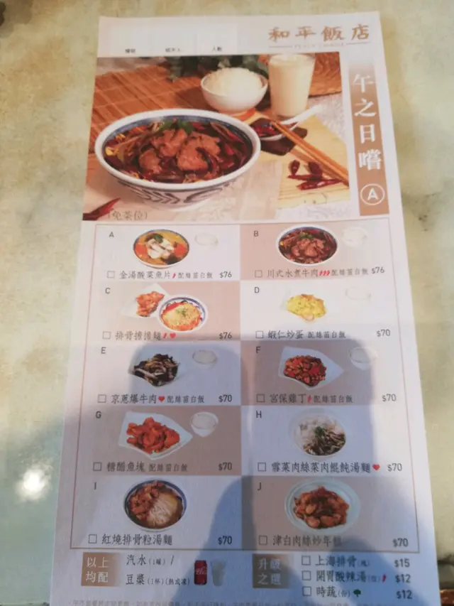 和平飯店係全商場唯一嘅上海菜餐廳😋亦係我家的食堂😍可惜於八月三十一日租約期滿😔於是相約家人開餐先😋先來自選四小碟👍鎮江餚肉、海蜇青瓜、花雕醉雞、四喜烤麩👍酸辣湯生煎牛肉餅不等你小籠包上海排骨擔擔麵👍紅燒排骨粒湯麵酸菜魚套餐👍魚片非常嫩滑👍👍勝瓜炒魚片👍紅油炒手黃金蝦球高力豆沙