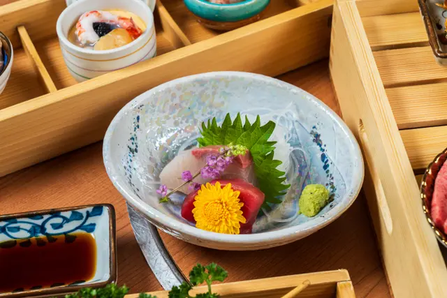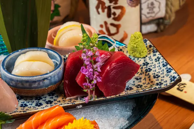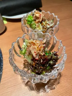 廚師精選日本新鮮空運刺身:鱆紅魚及吞拿魚,厚切又大片,富有光澤,新鮮甜美日本走地雞肉沙律