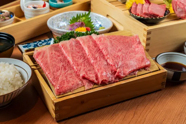 和牛上肩眼雪花分布平均,口感滑嫩多汁,非常高質!和牛西冷充滿細緻的油花,牛脂感最重白飯 & 麵豉湯