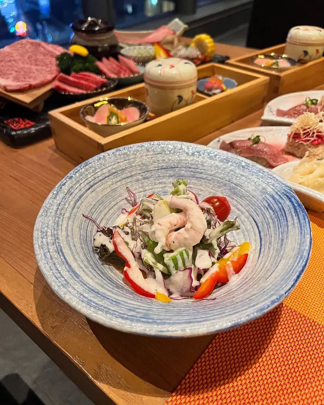 雞絲肉味濃郁,選用日本走地雞🐓新鮮青瓜片捲着翠綠沙律菜,口感爽脆,清新開胃日本產和牛 & 海鮮豪華拼盤