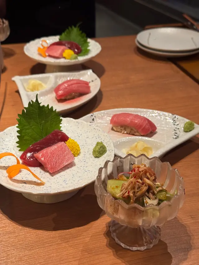 廚師精選日本新鮮空運刺身:鱆紅魚及吞拿魚,厚切又大片,富有光澤,新鮮甜美日本走地雞肉沙律
