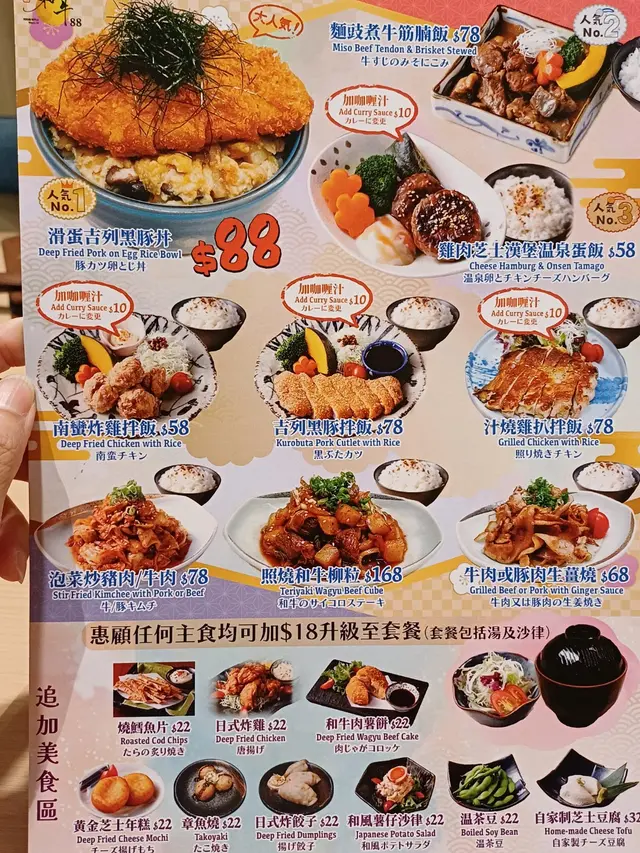 暴雨中意外發現的日式美味 francis2021等級12024-07-282K 瀏覽 關注 今天下午和家人外出時,一出MTR,忽然又下起大雨,剛好路上看到有間日本餐廳,看看餐牌有很多選擇,設計得好有日本色彩,即時入去試下。店內裝修很靚,有一金一白的大公仔,可能我地小朋友多,個個都去和兩個大公仔打卡影相。我們一行九個人,老板特別安排一張長桌給我們,方便大家傾計,招待一流。我自已特別愛食鰻魚飯,再加上午飯時間,十分肚餓,所以點左一個鰻魚定食來試下,鰻魚汁加飯,十分鮮味,開胃好味,跟餐有沙津和湯,真係抵食。小朋友揀左忌廉明太子鳥冬,未影相已開始食緊,味道當然好味,只是不能比相機先食 牛肉炒鳥冬定食性88蚊性價比高,又大碟,又好味另外叫了"一個人的浪漫套餐",有吉列豬扒烏冬 配小食芝士年糕,另外再加了一杯特飲,吉列豬扒炸得金黃可口,所以加多個吉列豬扒定食。另外來得和牛88,當然要叫和牛牛肩扒定食,份量比想像多又好味,下次一定再叫最後甜品雪糕我們叫了幾個開心果雪糕和朱古力雪糕,後來發現有一款海鹽雪糕,下次可以試下 …查看更多+ 5以上食評乃用戶個人意見 , 並不代表OpenRice之觀點。3分享暴雨中意外發現的日式美味 和牛88 https://s.openrice.com/QrbT00b1L00檢舉 張貼 評分4味道4環境4服務4衛生3抵食推介美食鰻魚飯牛肉炒鳥冬定食"一個人的浪漫套餐",有吉列豬扒烏冬 配小食芝士年糕吉列豬扒烏冬定食和牛牛肩扒定食好特別既開心果雪糕一個人的浪漫套餐 吉列豬扒烏冬用餐日期2024-07-27等候時間5 分鐘 (堂食)人均消費$100 (午餐)慶祝紀念紀念日