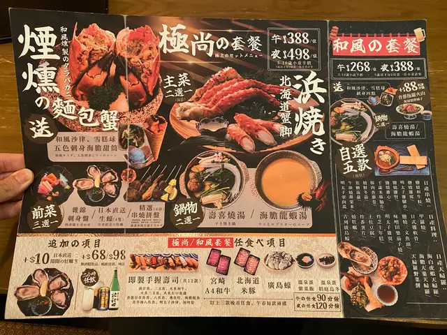 在尖沙咀的居酒屋宮崎和牛,一場美味的盛宴正等待著我們的到來。這裡的午市套餐讓食客在90分鐘內隨意享用,簡直就是吃貨的夢想!(順便一提,有一些食物是任食的,而有一些菜式則是按人頭計算。)。一進門,就被即做手握壽司的香氣撲鼻而來。油甘魚、三文魚、火炙三文魚……好像每一種魚都在呼喚著我!尤其是火炙左口魚邊,那微微炙烤的香味,讓人忍不住一口接一口。還有飛魚籽和海膽魷魚,真的是讓人驚喜連連!。鍋物方面,我們可以選擇壽喜燒湯底或日式豆乳豚骨湯。筆者和朋友各選了一款,鍋中煮著宮崎A4和牛、北海道米豚和廣島牡蠣,色香味俱全。肉質鮮嫩,簡直可以說是肉食者的天堂!。套餐一:帝王蟹腳大漁浜燒拼盤套餐一上桌,帝王蟹腳大漁浜燒拼盤就吸引了我們的目光。首先,和風沙律清新的口感讓我們的味蕾瞬間覺醒,搭配著日本A級海膽蟹肉甜筒,簡直是海洋的味道在舌尖上舞蹈!接下來的五款大漁浜燒,每一款都讓我們驚呼連連。。- 北海帝王蟹腳:肉質鮮甜,讓人忍不住再來一塊!- 鹽燒牡蠣:那種海水的鮮味,彷彿把我們帶回了大海。- 金蒜芝麻燒帆立貝:香氣四溢,金蒜的味道完美融合,令人陶醉。- 鹽燒大蝦:大蝦的彈牙口感,讓我們的每一口都充滿驚喜。套餐二:巨型爆膏大頭蝦串燒拼盤接著,巨型爆膏大頭蝦串燒拼盤也不甘示弱。牛油果醬凍豆腐沙律,清爽又有層次,讓我們的胃口大開。而那6片薄切的日本真鯛,鮮嫩得讓人不敢相信!最驚艷的當然是那隻10寸的巨型爆膏大頭蝦,搭配海膽黃金蟹膏醬,簡直是視覺與味覺的雙重盛宴!每一口都是濃郁的海鮮風味,讓我們不禁感慨:“這就是人生的極致享受!”還有那五串特選生燒串燒,焦糖菠蘿的甜蜜,千歲米豚腩的香嫩,明太子雞腿串的獨特風味,以及鹽燒和牛粒、燒鮮冬菇的完美搭配,真的是讓我們忍不住一串接一串!…查看更多