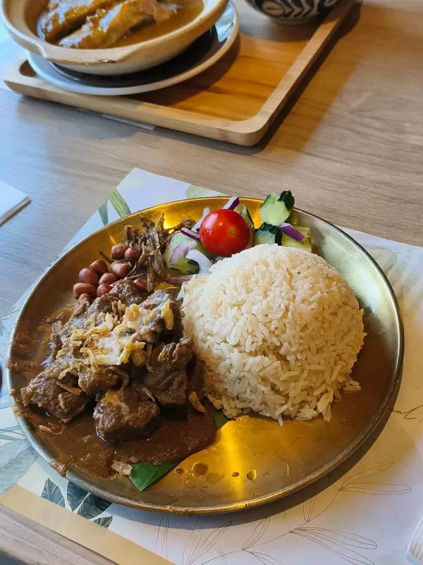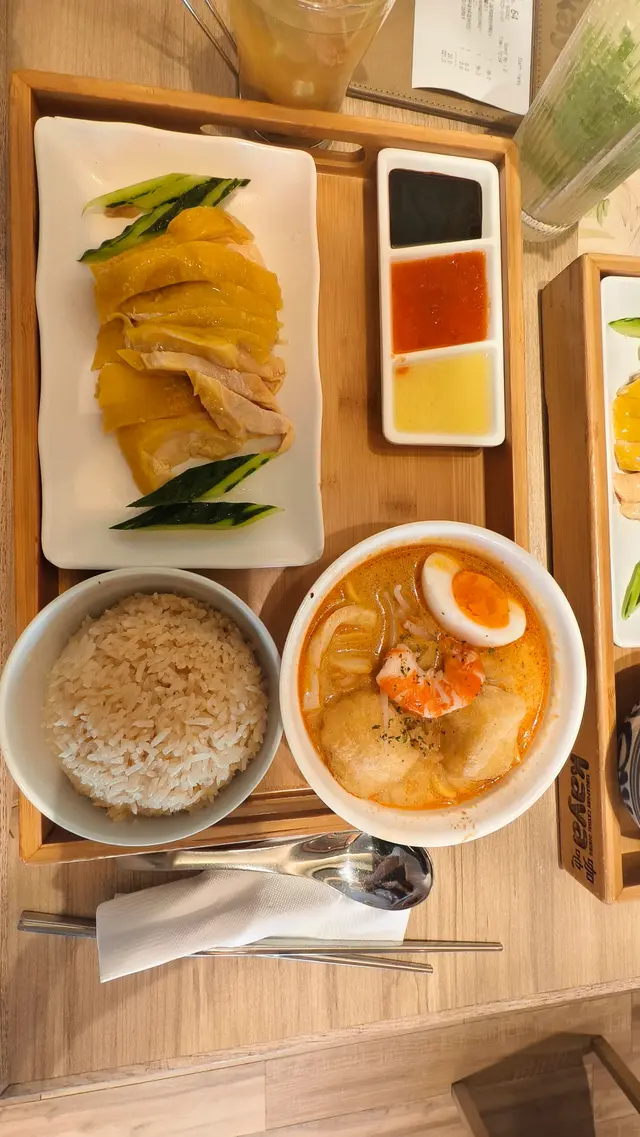 講起新加坡菜,第一時間諗起之前食過嘅海南雞飯、喇沙、椰漿飯等等菜式。今次去屯門錦薈坊 - 咖吔,品嚐一下地道新加坡風味。餐廳以淺木色傢俱為主,地方闊落,空間感足,環境自然舒適。海南雞飯 $68擺盤吸引又豐富,去咗骨嘅海南雞,啖啖肉,食起嚟很方便,雞皮同雞肉之間有層啫喱,皮爽肉嫩,配備薑蓉、甜醬油及辣椒醬,三款醬都咁出色,加上雞油飯都幾大碗,油香撲鼻,仲配埋蟲草花湯,清甜潤喉,呢個餐真的高質素。馬來咖哩豬扒 配米飯 $60用砂鍋盛載可保持熱力溫度,豬扒厚切,肉質嫩滑,香脆入味,咖哩汁濃郁,與白飯拌勻一齊食好惹味。新加坡喇沙 $56覺得喇沙係好感受到地道新加坡菜色,依度嘅喇沙好足料,當中有鮮蝦、魚蛋、豆卜、魚片、流心雞蛋、芽菜、紫洋蔥、蝦乾等等,湯頭金黃色,賣相好搶眼,椰香味非常濃,帶少少辣,好開胃,麵條吸收咗湯汁,真的很好味。新加坡鹹蛋黃單骨雞翼 (4件) $32雞翼一上枱熱辣辣,即點即炸夠新鮮,炸至外皮金黃香脆,內裡嫩滑有肉汁,鹹蛋黃醬汁香濃惹味。新加坡鹹蛋黃魚皮 $28即點即製,塊塊魚皮都沾滿鹹蛋黃醬,酥脆可口,魚味突出,鹹蛋味香濃。芒果雪糕沙冰 (+$12)芒果沙冰口感幼滑,冰凍解膩,芒果汁同芒果雪糕味道香濃清甜。海鹽雪糕椰汁珍多冰 (+$12)珍多冰上面有海鹽雪糕,好吸睛!雪糕香濃嘅海鹽味,珍多冰裡面有滑嘟嘟嘅粉條,好清爽,而且好香椰子味。馬來拉茶 (+$3)拉茶淡淡嘅茶味,甘醇清香,口感幼滑。…查看更多