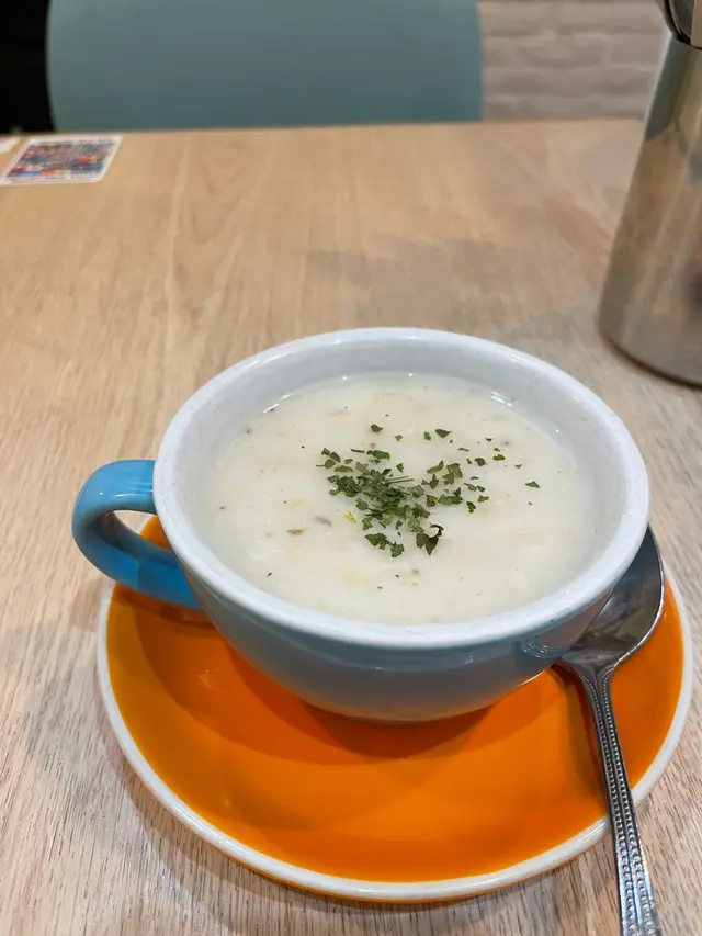 今日收到咖啡灣喺面書寫七月內將會結業,今日特意來幫襯一下。今日叫咗佢個Lunch Set, 墨魚汁明太子帆立貝意粉$78, 在另外叫多個鮮奶咖啡+$8店舖內環境舒適坐咗一陣,首先上咗個蘑菇湯,第一下以為係飲品,心諗明明我叫鮮奶咖啡,點解係白色嘅