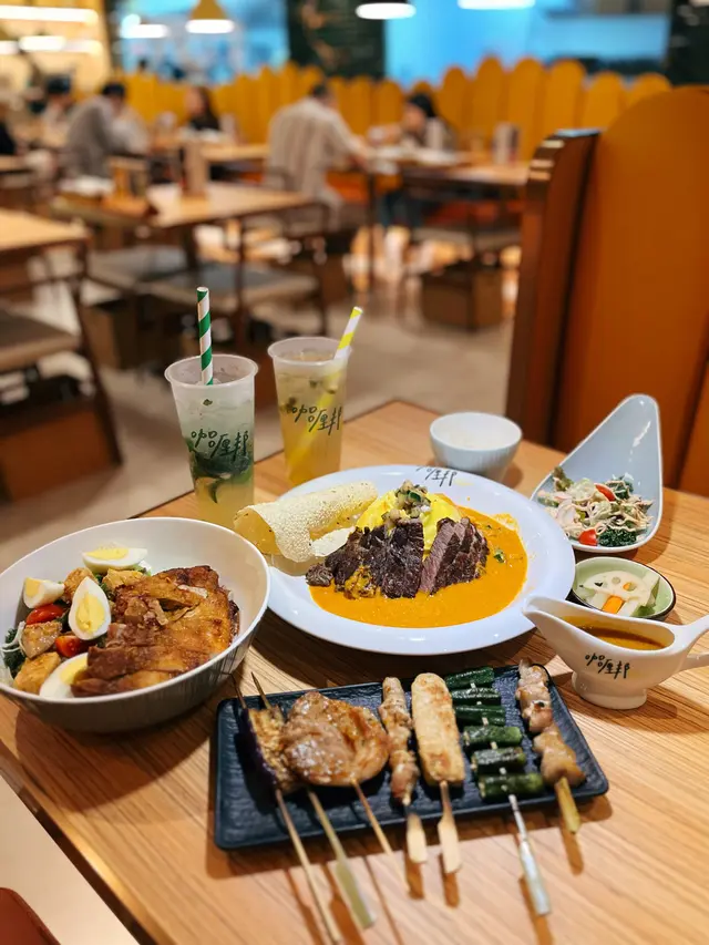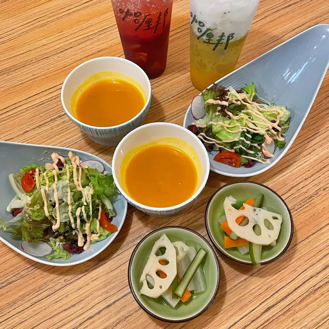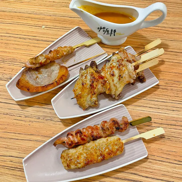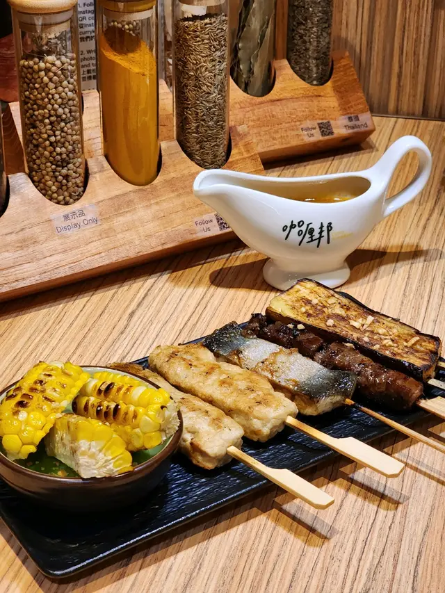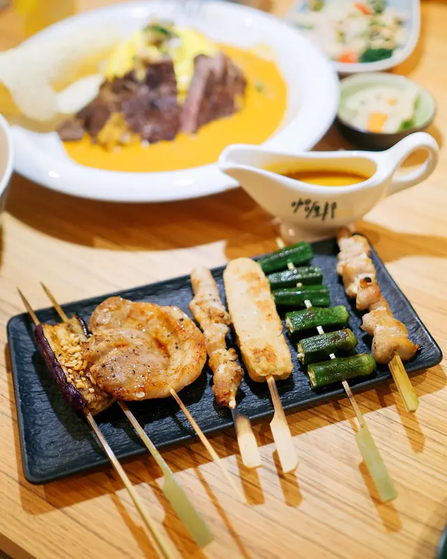 呢間餐廳主打咖喱提供5個辣度級別可以選擇🌶️有泰國、新加坡、印度同日本咖喱每款咖喱都各有獨特風味一次過可以味遊四國呀🍛-🍢6串串燒組合($138)串燒組合指定自選A組x2 + B組x4配上咖喱汁,別有一番風味呀❣️A組🔸豚肉波板糖豚肉厚切成波板糖模樣🍭咬落厚身軟腍推介大家可以試吓呀😋🔸豬頸肉串相對豚肉波板糖好似無咗大塊但爽口美味喔💕B組🔸雞軟骨肉棒雞肉同雞軟骨比例恰到好處咬落口憑豐富呀!🔸雞肉串 燒得焦香有肉味👍🏻🔸雞中翼串 x 2雞中翼開邊食起嚟冇咁論盡🥰雞皮香脆內裏肉嫩而且有肉汁❤️‍🔥🇸🇬雞爸隆爸($158,包餐湯&沙律)醬汁用咗13種香料咖喱葉、青檸葉同蝦醬以及加入椰漿平衡咗香料嘅味道👍🏻而辣度就揀咗3級入口辣度適中椰香味濃郁惹味喔😋再配上香煎雞扒同蛋包飯超豐富飽肚呀💕🇮🇳印度神牛($178,包餐湯&沙律)主要香料有薑黃、芫荽、小茴香、丁香同綠豆蔻上菜果陣...店員會拎埋放有香料嘅試管俾大家睇吓同聞吓喔🧪香辣濃烈嘅印度咖喱汁配上西冷牛扒呢個crossover又幾特別味道都好正呀💯值得一讚嘅係西冷牛扒好大塊,肉質軟腍呢👍🏻🍹飲品嗌咗兩款水果梳打分別係紅邦邦 ($19)同 橙邦邦($24)前者係用raspberry 調整酸酸甜甜,清爽醒胃呀😋而橙邦邦就鮮橙加椰漿解辣唔錯喔👍🏻㊙️由即日起至8月31凡惠顧「咖喱邦」即可以半價優惠品嚐各款特色飲品餐廳仲會係呢段優惠期送出$30現金券㗎!查看更多