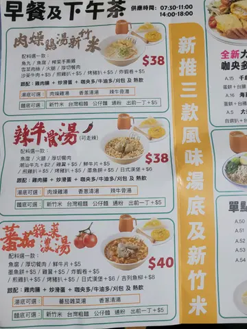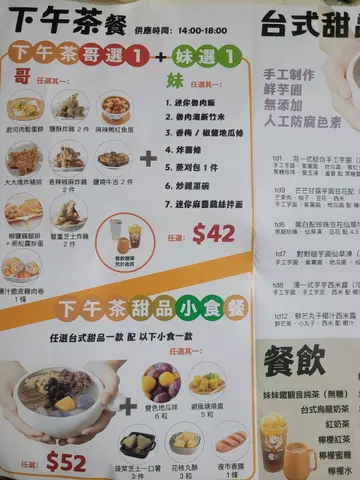 我們一家人,每一次來大埔,都會去街市尋食。但,間唔中,都想轉轉新口味既。而就在我們熟識的大明里,新開了一間叫《哥哥添飯、妹妹泡茶》的台式餐廳。當然,我們看到這兒有提供素食才會決定來的。餐廳有香港式既茶餐廳感覺,食品,尤其是飲品卻是台式的。所以,我就有大埔的《哥哥添飯》、台灣的《妹妹泡茶》這一個標題了。太太點的美食是帶點泰感覺的青咖喱素菜煎蛋飯。咖喱,辣度是可以孺意的,不多間就會給你正常辣,也即是很辣。然而,最令人開心的並不是咖喱,而是大大隻,脆邊兼香味十足的太陽蛋,而且,那蛋黃絕對是溏心的啊。我就點了一碗台式魯肉飯,鹽燒厚牛舌拼魯肉飯。鹽燒厚牛舌絕對是一個又香又爽脆的美妙食品。而且,這樣烤到香,直接令味道更完美。此外,魯肉,溏心蛋同酸蘿蔔就直接令到碗內的白飯,變成惹味可口的食品。改日,辦完些小事情,便帶同阿女於下午茶時段再拜訪此店了。太太吃的東西一樣,而我就黠了一個午餐肉蕃茄濃湯新竹米粉的下午茶餐,同阿女分享。蕃茄濃湯底,的確是非常濃,而新竹米粉就煮到爽口,口感一流。再加上兩大片的餐肉,一碗夠晒飽。跟餐有腸仔炒蛋及多宜,而台灣腸就是跟米粉的 (因為是雙併麵食)。台灣腸,味道香甜,同廚司腸相比之下,味道的確是好N陪。炒蛋夠滑,也是令大人小朋友都美滿的。飲品,身為哥哥的我就要了一杯港式熱奶茶。茶的味道是香港式的,奶的味道,也是香港式的。所以整杯奶茶好合胃口,好啱香港人口味。太太要的珍珠奶茶,就是介乎港式同台式之間。奶,不是用奶粉,而是用上了鮮奶,直接令到味道更坐。而珍珠夠大粒,也夠彈彈的。不錯。雖說不上是高水準,但各樣食物都好好味道啊。有好食的出品,有令太太滿意的素食餐,好自然會多來。執筆前,我們也來過兩、三次了。…查看更多