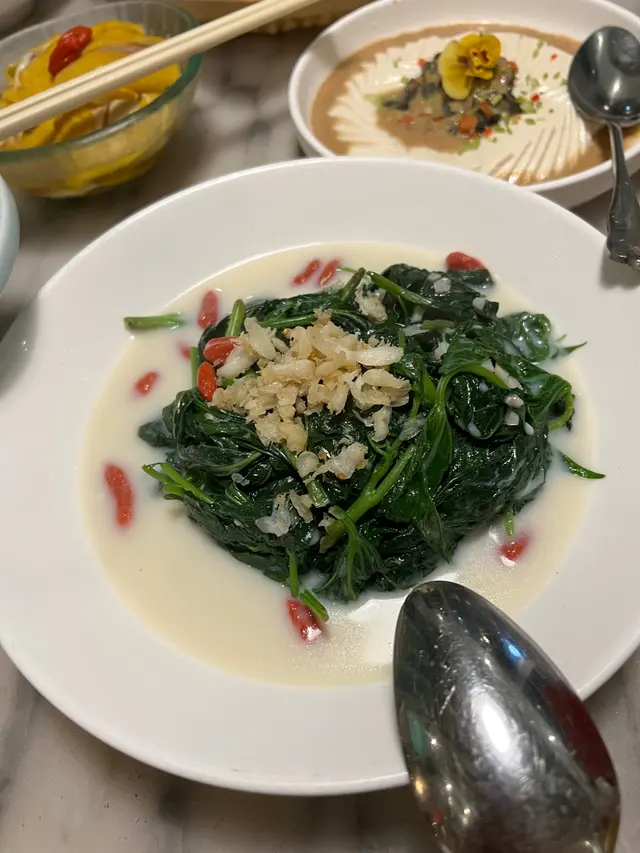 唐宮小聚是一間新派中菜, 餐廳環境不似傳統酒樓,廚房採用開放式見到食物新鮮熱辣整出嚟即時胃口大開。今次試咗兩款招牌,「招牌乳鴿」 皮脆,肉汁多到咬落爆出嚟!至於「冰鎮咕嚕肉」 就外層冰涼脆口,內裡熱辣軟嫩,酸甜汁掛得勻循,一冷一熱口感勁複雜,同普通咕嚕肉完全係兩個世界!連點心都絕不馬虎,精緻到唔捨得食!簡單如炒四季豆都鑊氣沖天,至於個蔥油拌麵直頭係靈魂所在!師傅用新鮮蔥段爆香,唔係求其用現成蔥油,每條麵都掛滿焦香蔥油,為咗呢個麵絕對可以翻兜十次!…查看更多